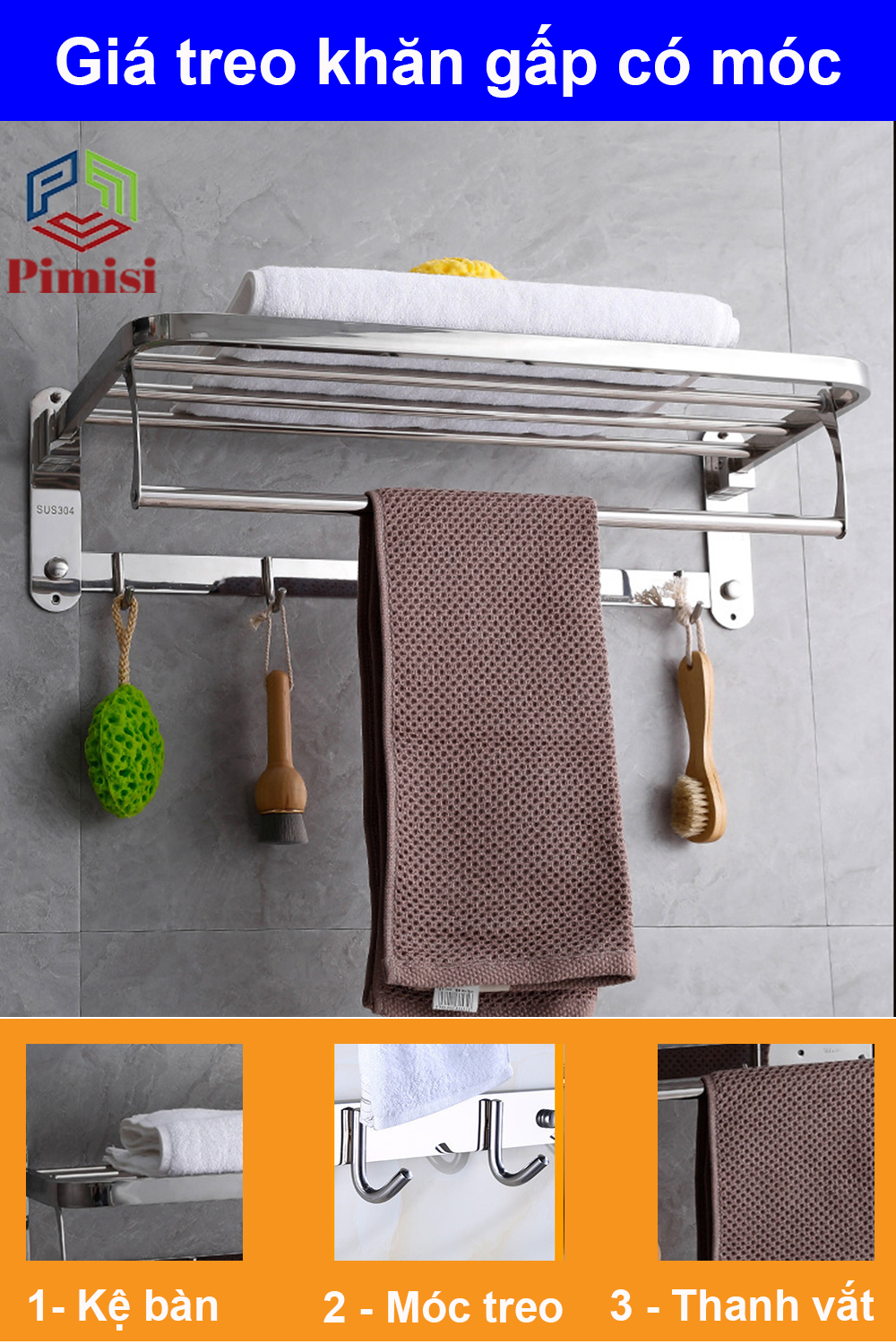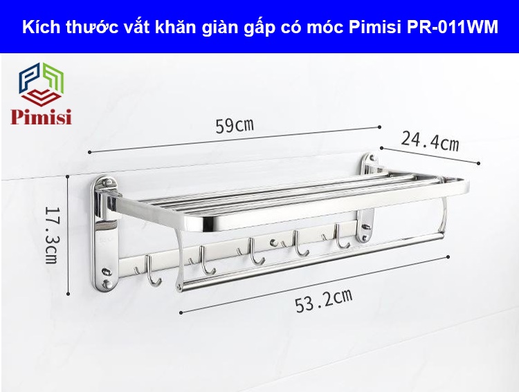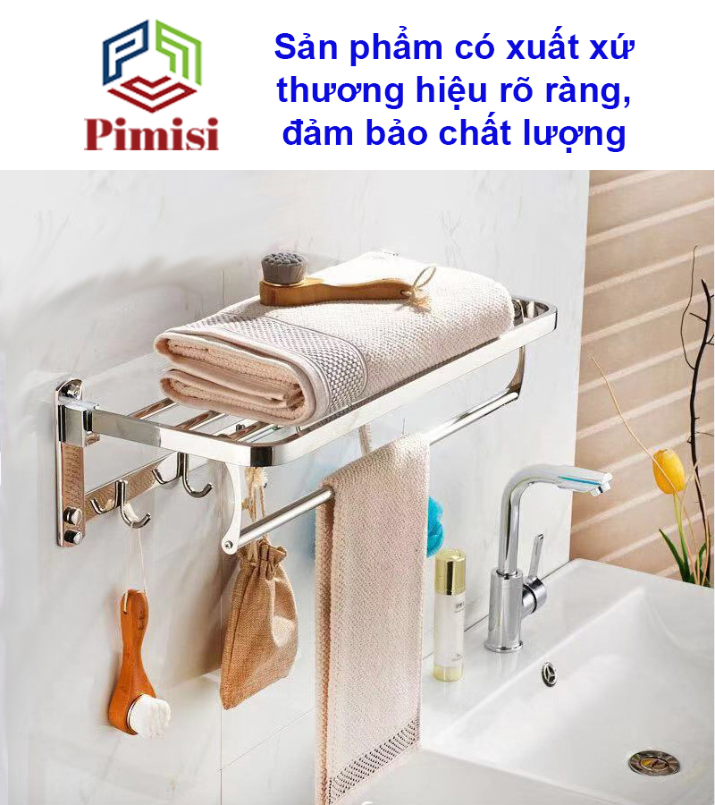 - Giá treo khăn nhà vệ sinh Pimisi PR-011WM là sản phẩm đa năng vì trong cùng sử dụng cho khăn tắm khô gấp gọn để trên dàn, còn khăn mặt vắt lên thanh đơn và kèm móc áo và các vật dụng…