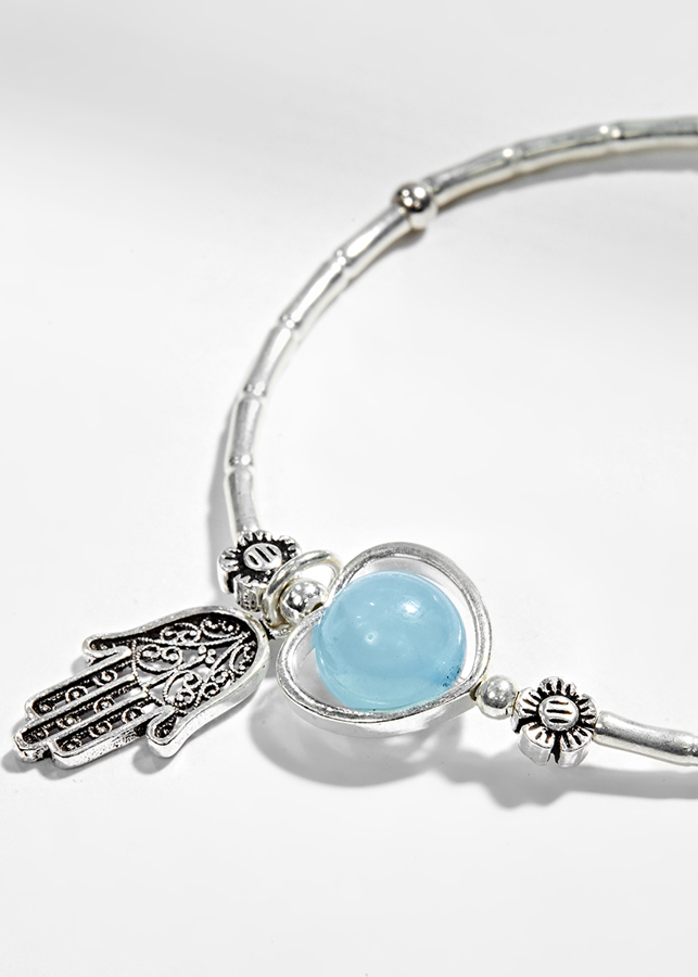 Vòng Tay Bạc 1 Hạt Đá Hải Lam Ngọc Phối Charm Bàn Tay Hamsa Bạc