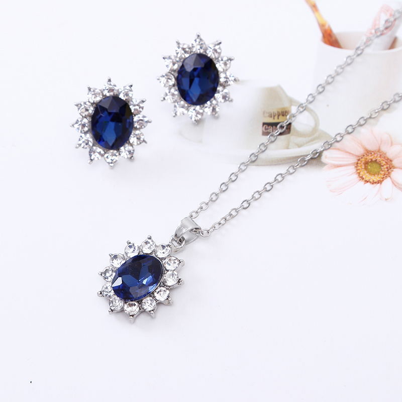 Bộ trang sức gồm 2 món dây chuyền và đôi bông tai thiết kế cùng kiểu, nổi bật với hình hoa đá xanh ấn tượng, tôn lên vẻ đẹp sang trọng, quý phái. Thích hợp trang điểm đi làm, đi chơi, phong cách nhẹ nhàng, hay quý phái với trang phục dạ tiệc dạ hội.