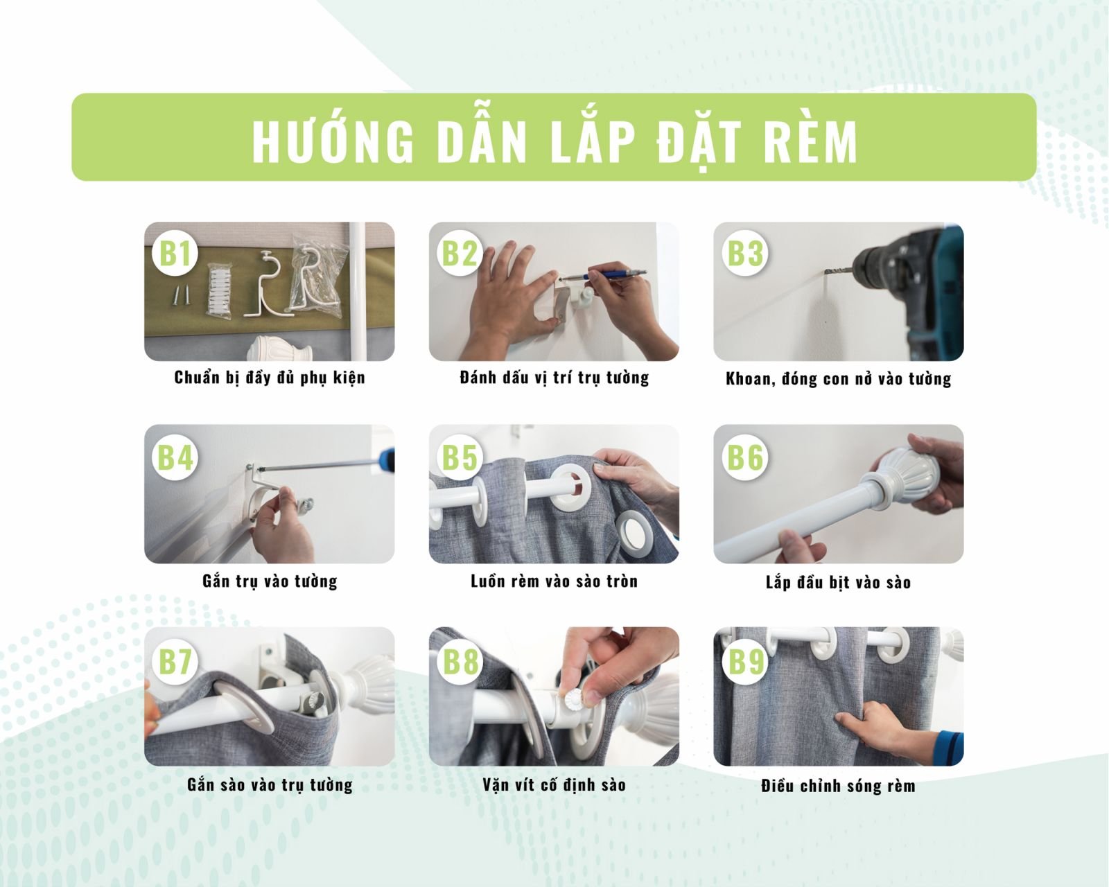 - Thanh treo chắc chắn cho rèm cửa