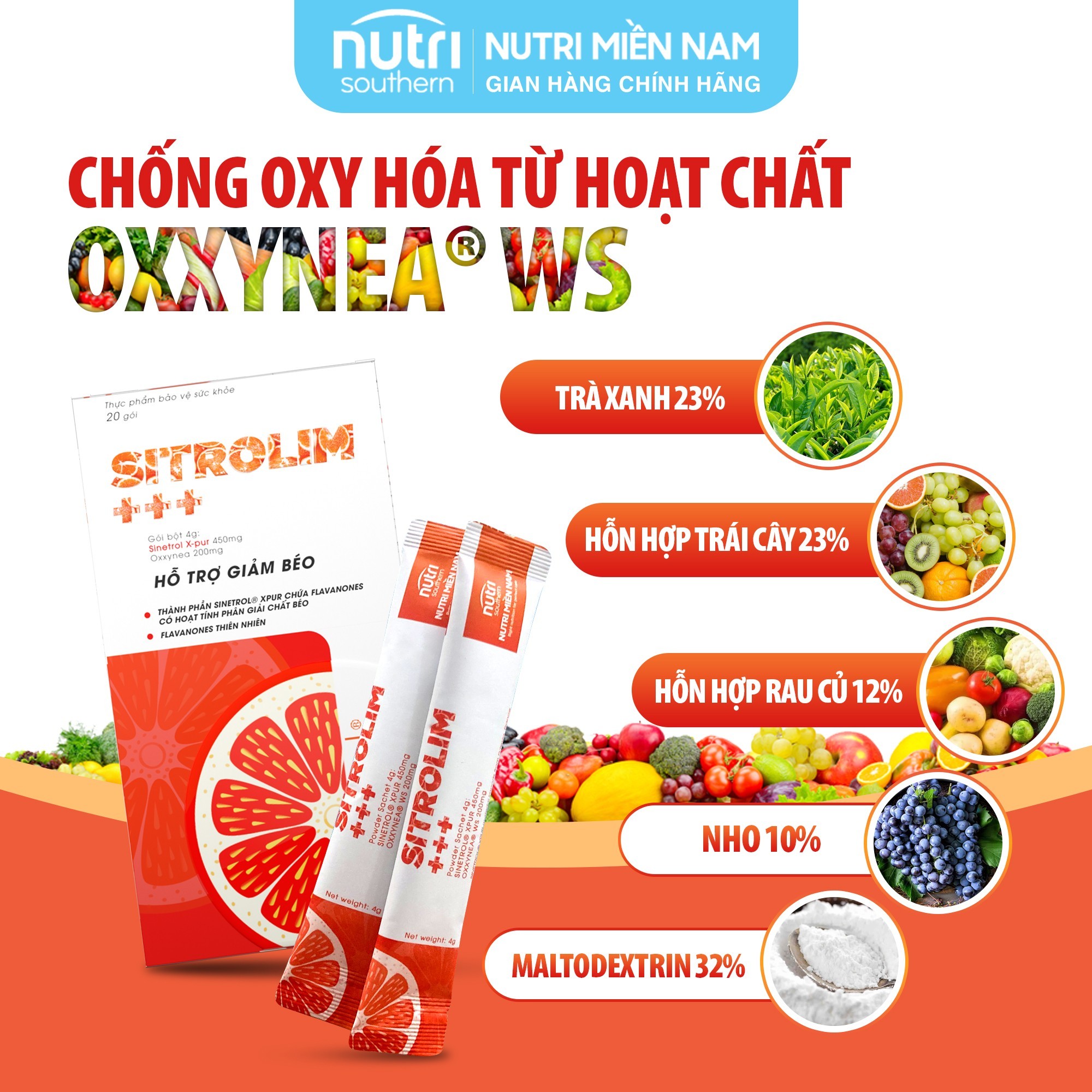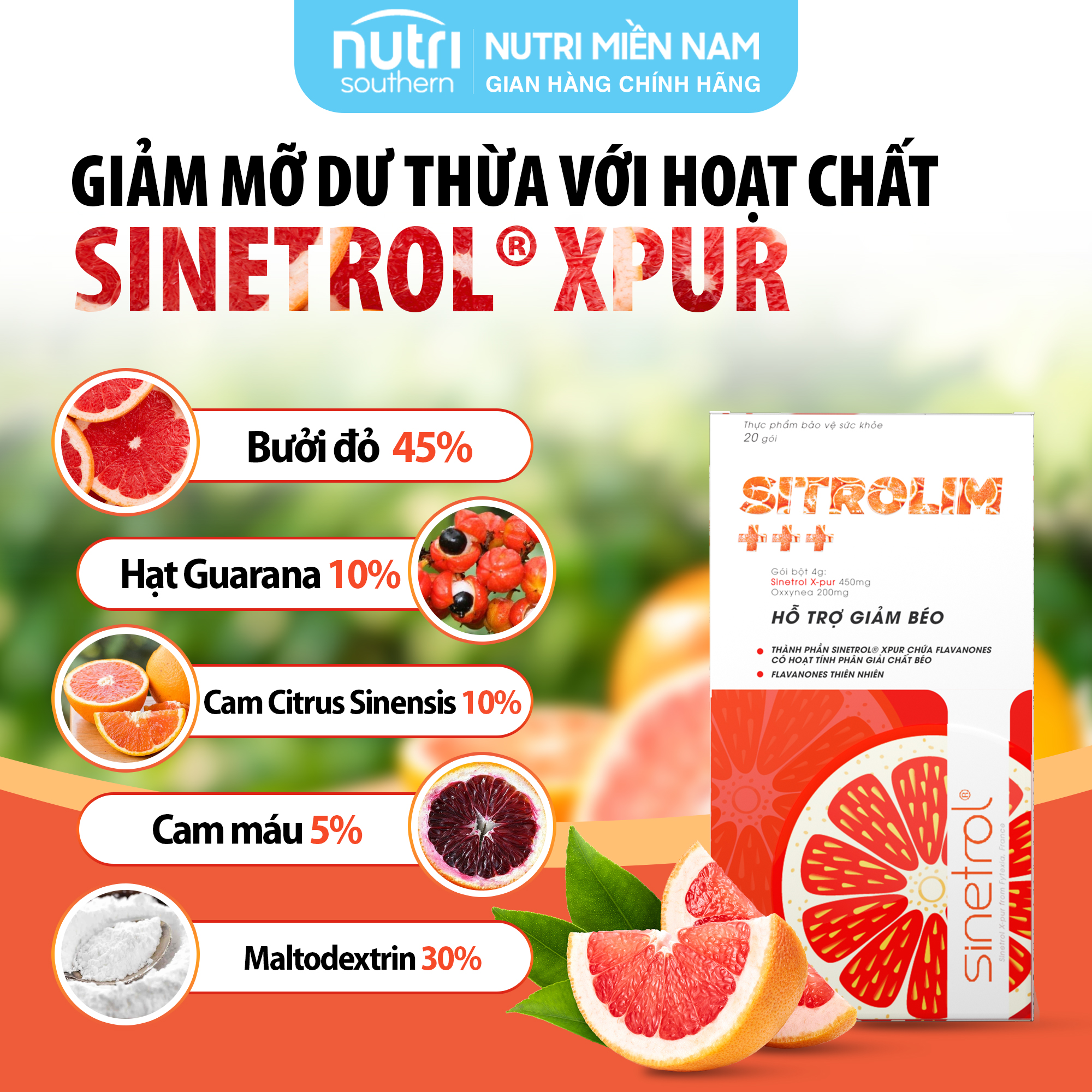 Sitrolim là sự kết hợp của 3 hoạt chất SINETROL XPUR, OXXYNEA WS, FOS (Fructo Oligosacharides) mang đến một sản phẩm hoàn hảo để hỗ trợ tăng cường chuyển hóa chất béo trong cơ thể, giúp kiểm soát cân nặng hiệu quả theo một cách an toàn như dùng nước ép trái cây