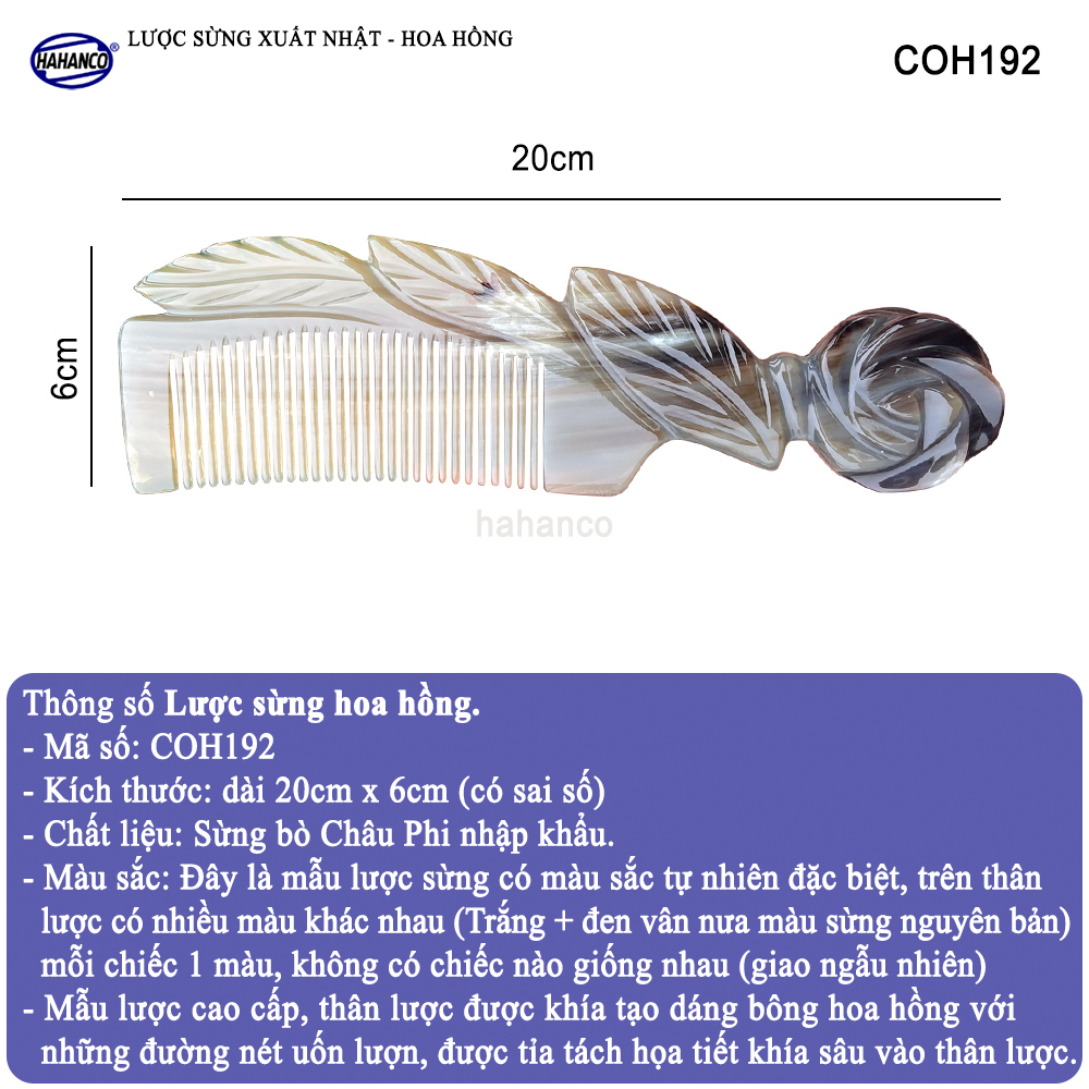 - Đây là mẫu lược sừng VIP màu vân nưa, được thiết kế hình bông hoa hồng biểu tượng của tình yêu, làm quà tặng rất ý nghĩa, với kích thước lớn, phù hợp với toàn bộ người sử dụng, có thể để bàn trang điểm rất sang. Sản xuất với nhiều công đoạn phức tạp, Được các nghệ nhân của HAHANCO thổi hồn vào chiếc lược này, tạo ra các họa tiết và đường nét uốn lượn sắc sảo, làm cho chiếc lược cổ điển không còn nhàm chán mỗi khi bạn cầm trên tay. Những chiếc răng lược được các bàn tay khéo léo mài dũa từng chiếc một cẩn thận để đạt được độ nhẵn bóng, khi chải tóc sẽ không làm gãy và rụng tóc.