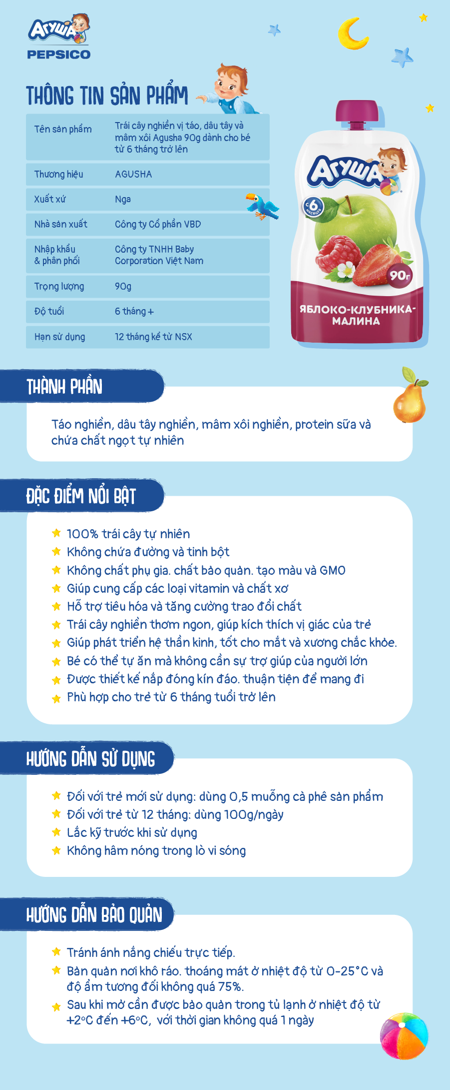 372,400₫Giới thiệu Thùng 10 Gói Trái cây nghiền vị táo, dâu tây và mâm xôi Agusha 90g/gói dành cho bé từ 6 tháng trở lên