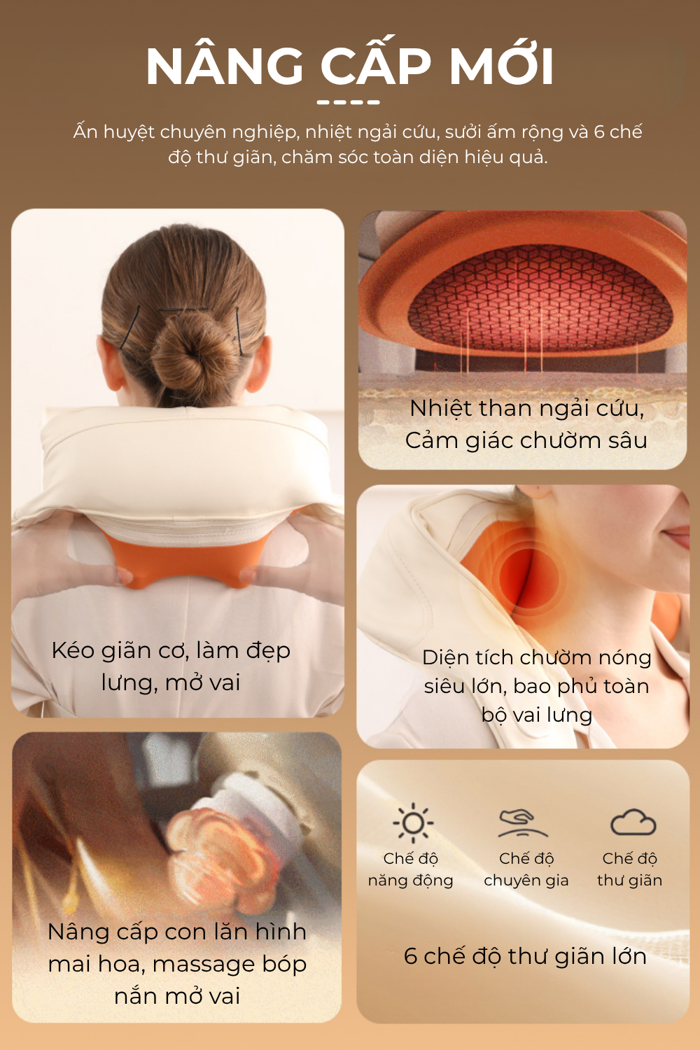 6 chế độ massage linh hoạt: mở vai, thả lỏng, bóp day, thư giãn, tăng lực, chế độ kết hợp – đáp ứng nhu cầu của nhiều đối tượng.