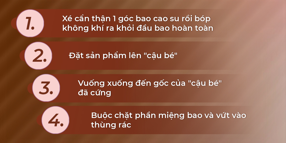 ✪ Cách dùng: Cẩn thận xé 1 góc bao cao su rồi bóp không khí ra khỏi đầu bao, sau đó đặt bao vào đầu "khủng long con" đang cứng rồi vuốt xuống đến gốc. Sau khi quan hệ xong giữ đầu bao rồi từ từ rút "khủng long con" ra tránh làm tràn tinh dịch. Thắt miệng bao rồi vứt vào thùng rác.