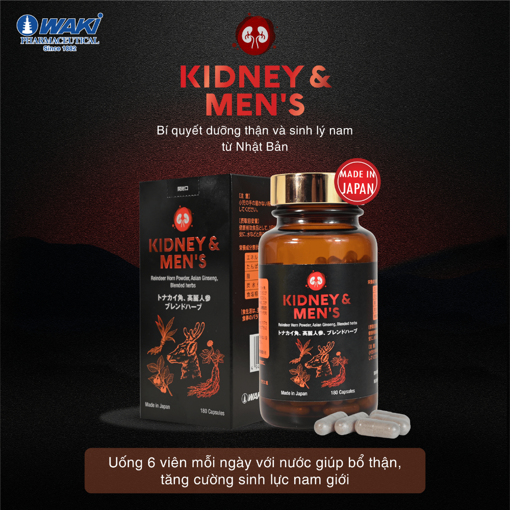 Sản phẩm Kidney & Men’scủa Nhật Bản – Bí quyết dưỡng thận và sinh lý nam. Đây là một sản phẩm trong dòng sản phẩm chăm sóc sức khỏe của tập đoàn dược phẩm Waki Pharma có truyền thống 200 năm tại Nhật Bản chứa các thành phần hoàn toàn từ thiên nhiên giúp bồi bổ thận và sinh lực nam.