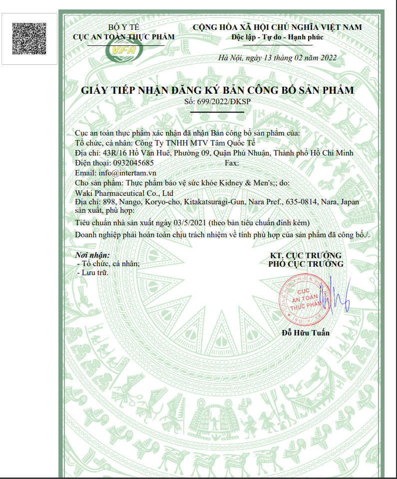 Sản phẩm Kidney&Men’s đã được cấp giấy chứng nhận chất lượng sản phẩm của Bộ Y tế Việt Nam phù hợp với các quy định về chất lượng, đảm bảo vệ sinh an toàn thực phẩm.