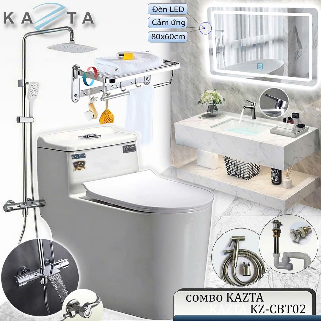 Mua COMBO Thiết Bị Nhà Tắm Cao Cấp KAZTA KZ-CBT02: Bồn cầu liền khối, Lavabo âm bàn đá, Gương đèn, Sen tắm đứng nóng lạnh, kèm phụ kiện giá rẻ nhất ở đâu?Giới thiệu COMBO Thiết Bị Nhà Tắm Cao Cấp KAZTA KZ-CBT02: Bồn cầu liền khối, Lavabo âm bàn đá, Gương đèn, Sen tắm đứng nóng lạnh, kèm phụ kiện