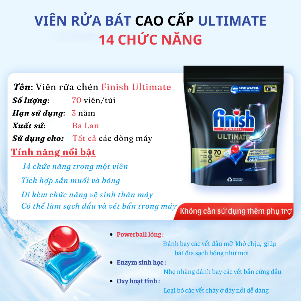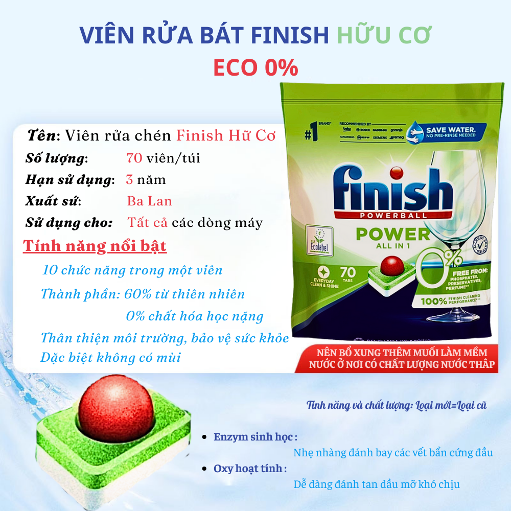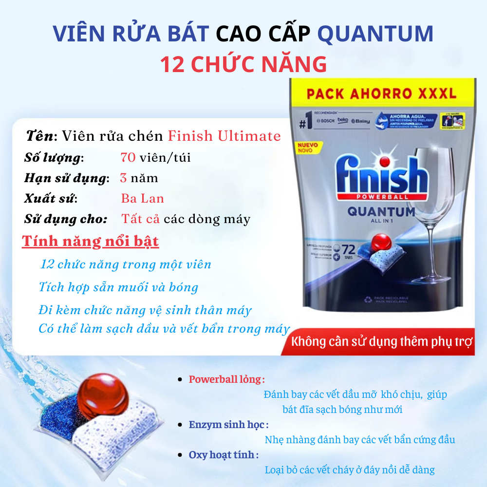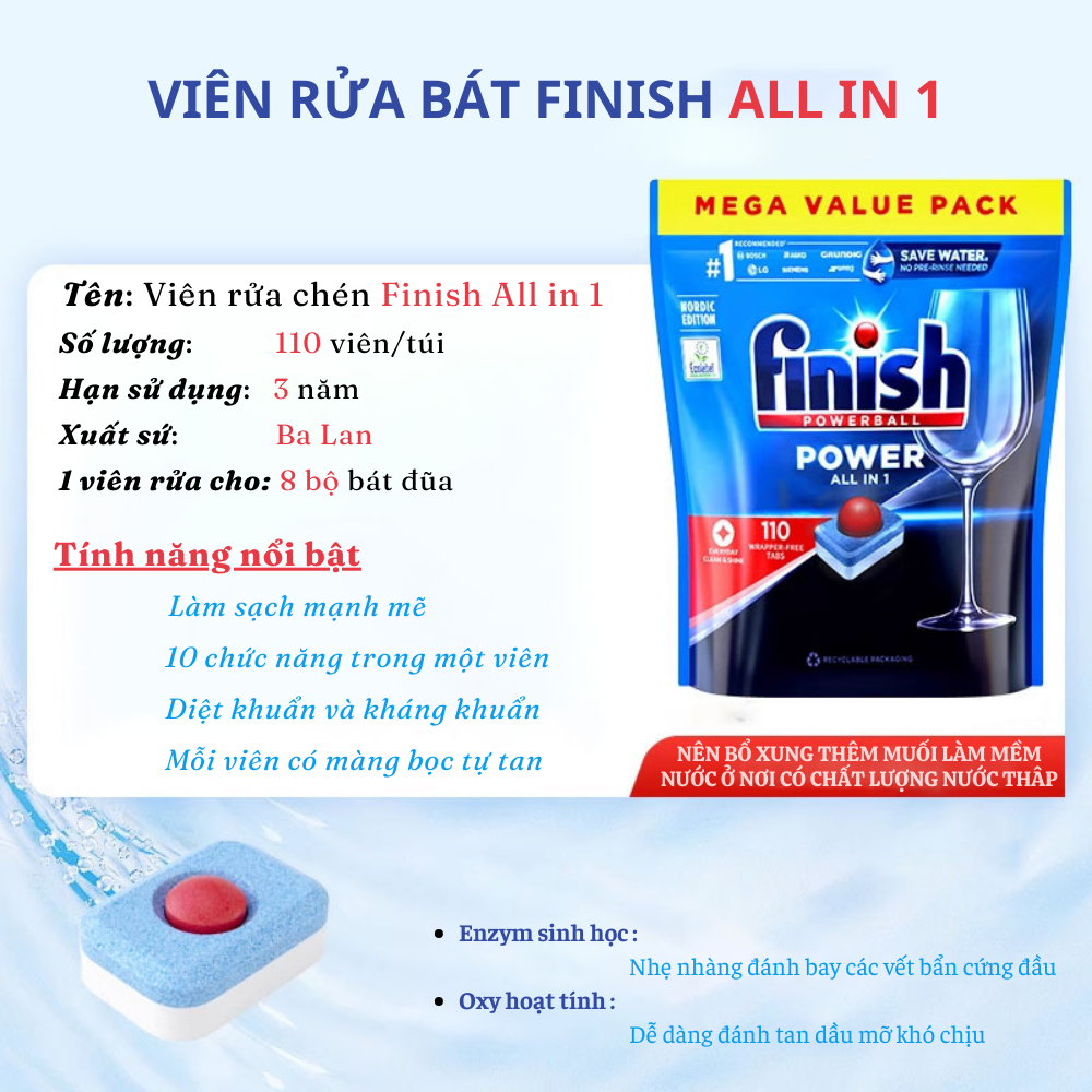 + Rửa: Viên rửa bát bát finish dạng nén hoạt động tự động trợ giúp quá trình rửa tổng hợp, đảm bảo độ sáng bóng nguyên bản trên thủy tinh, tách bộ đồ ăn khỏi vết bẩn.