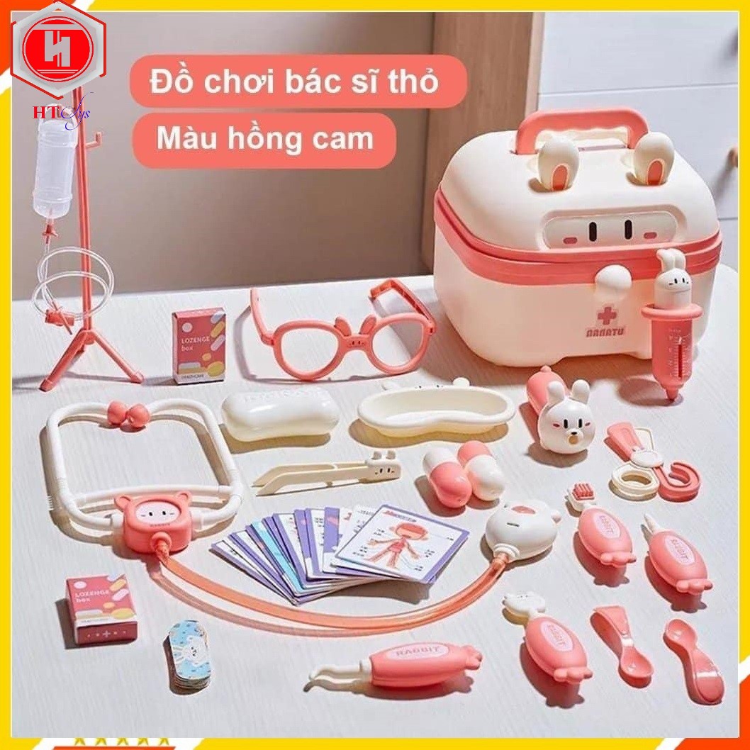 - Bộ đồ chơi bác sĩ cho bé 36 chi tiết gồm đầy đủ các dụng cụ chữa bệnh như hộp đựng dụng cụ, ống nghe nhịp tim, bảng ghi chú,….(không có bảng chụp x-quang) được thiết kế đáng yêu, dễ thương với tông màu chủ đạo là màu hồng và xanh tươi sáng, tất cả để trong một chiếc hộp tai Thỏ xinh xắn, giúp trẻ thỏa sức vui chơi mà vẫn đảm bảo cất gọn nhiều đồ sau khi chơi xong.