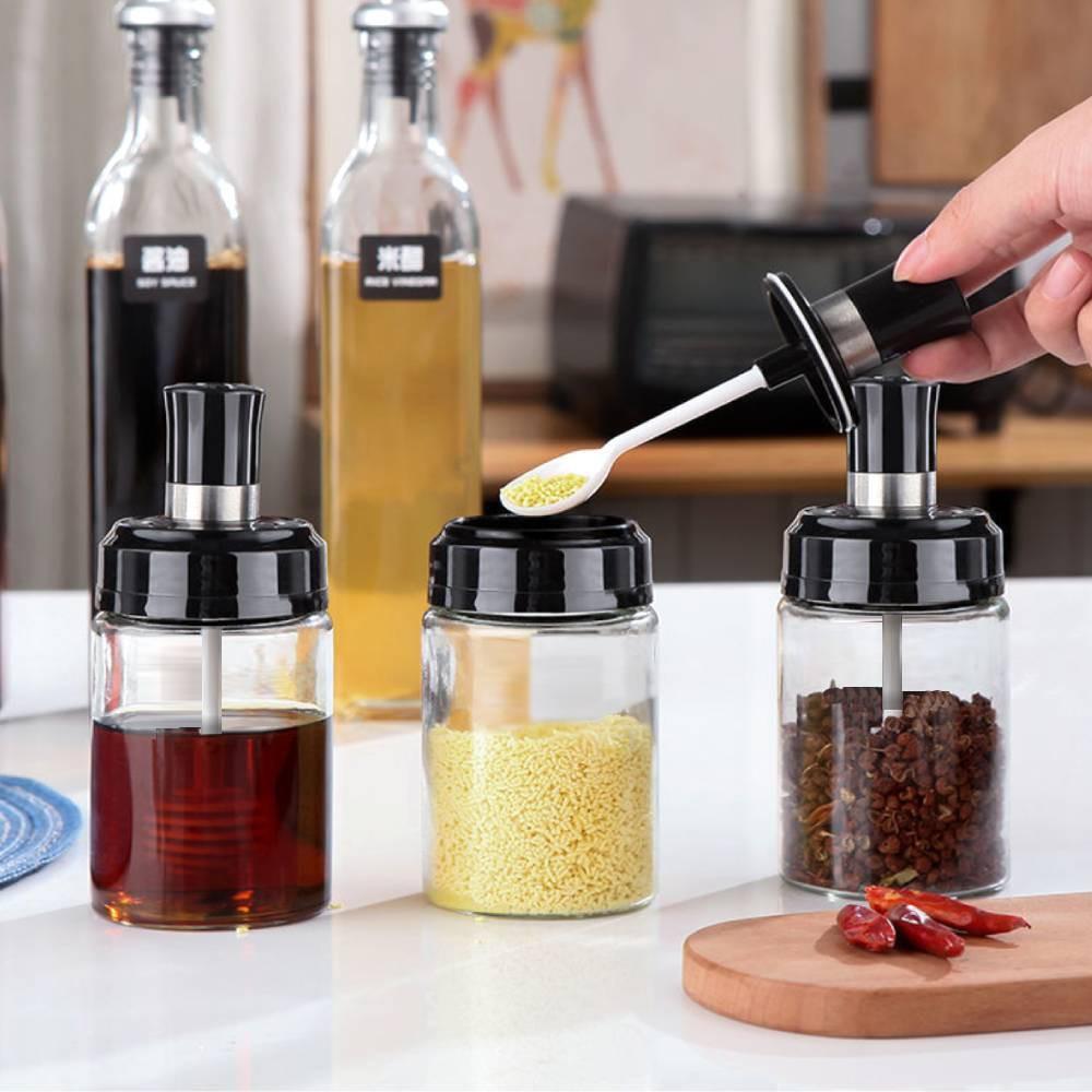 Hũ đựng gia vị thuỷ tinh thiết kế muỗng nắp là mẫu hiện đại và mới nhat 2021 để đựng gia vị - có muỗng gia vị gắn liền với nắp để tiện sử dụng 1 tay.