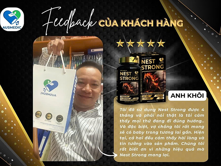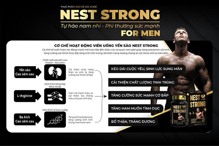 - Nest Strong từ thương hiệu Ausmedic là viên uống yến sào tiê.n phon.g tại Việt Nam với công thức độc quyền kết hợp 100% YẾN SÀO NGUYÊN CHẤT từ Cần Giờ cùng bộ tứ hoạt chất hỗ trợ tăng sinh lý (Sâm Cau, Ba Kích, L- Arginine và Kẽm) theo nồng độ chuẩn y khoa, giúp Hỗ trợ bổ thận, tráng dương, tăng cường sinh lực, giúp cải thiện sinh lý nam giới, tăng sinh tinh trùng, dễ sử dụng hơn yến chưng truyền thống, đã được kiểm nghiệm a.n toà.n đạt chuẩn FDA (Mỹ) và đạt kiểm nghiệm khắt khe của Bộ Y Tế Việt Nam (7121/2024). Mỗi viên Nest Strong là kết tinh công nghệ yến sào dạng viên tiê.n phon.g tại Việt Nam, giúp bảo toàn dưỡng chất – tiện lợi – dễ hấp thu – nhưng vẫn giữ nguyên hiệu quả như yến chưng truyền thống.