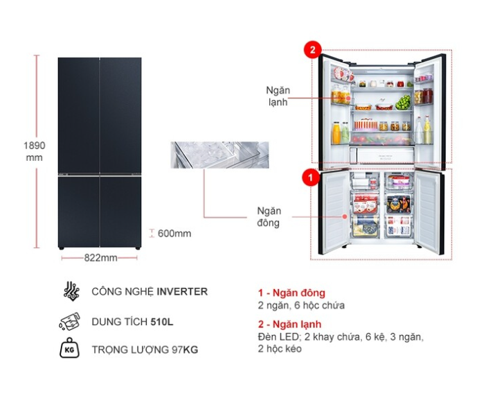 Dung tích 510 lít, thích hợp cho gia đình 4 - 5 thành viên.