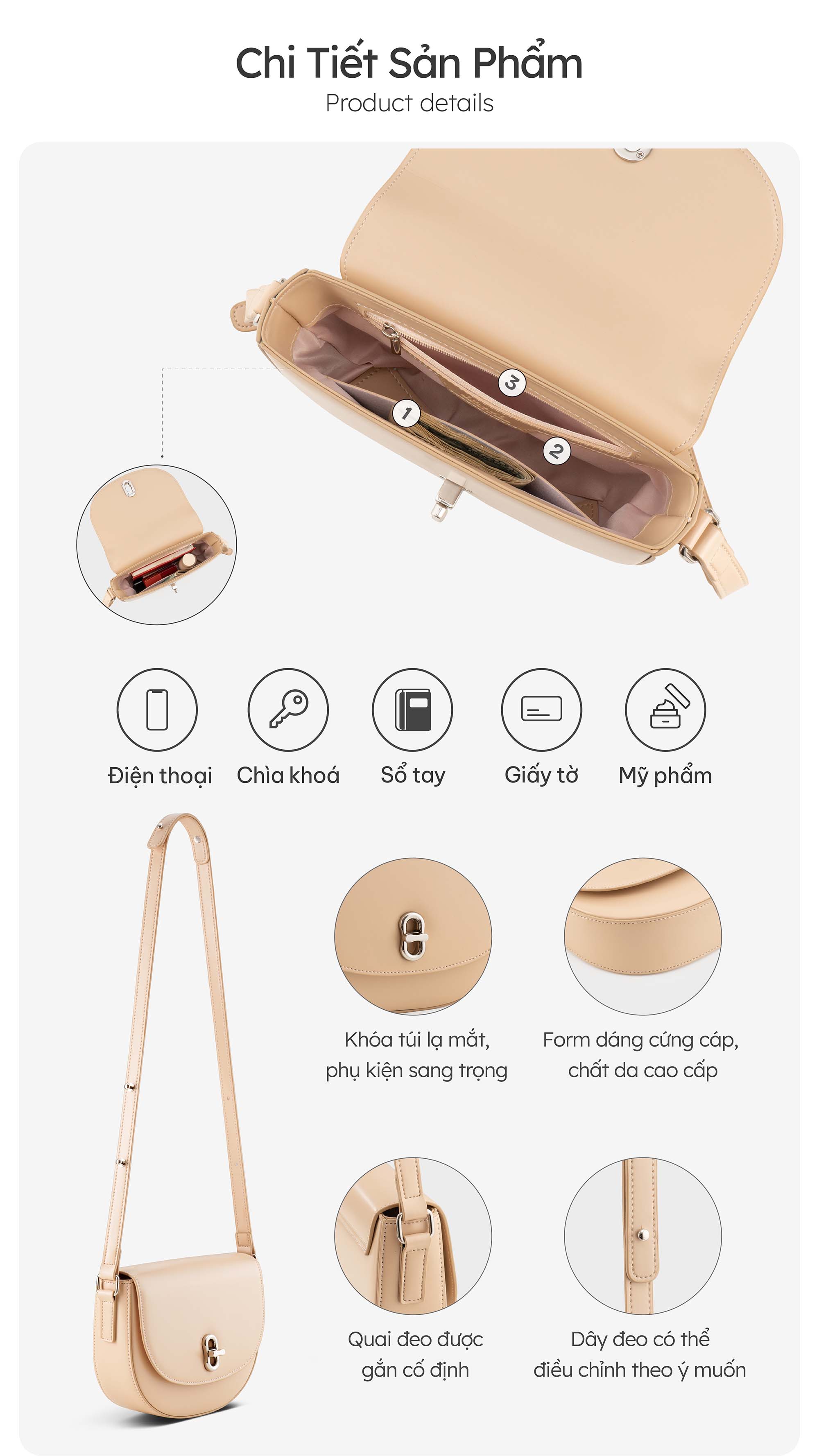 - Công dụng: Đựng tiền, điện thoại, son, phấn, chìa khóa, CCCD …