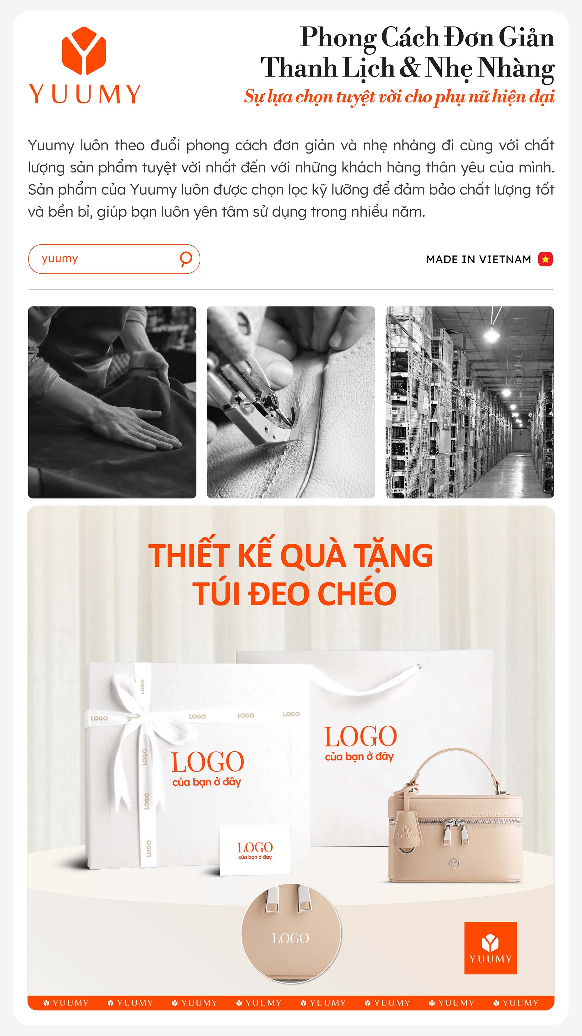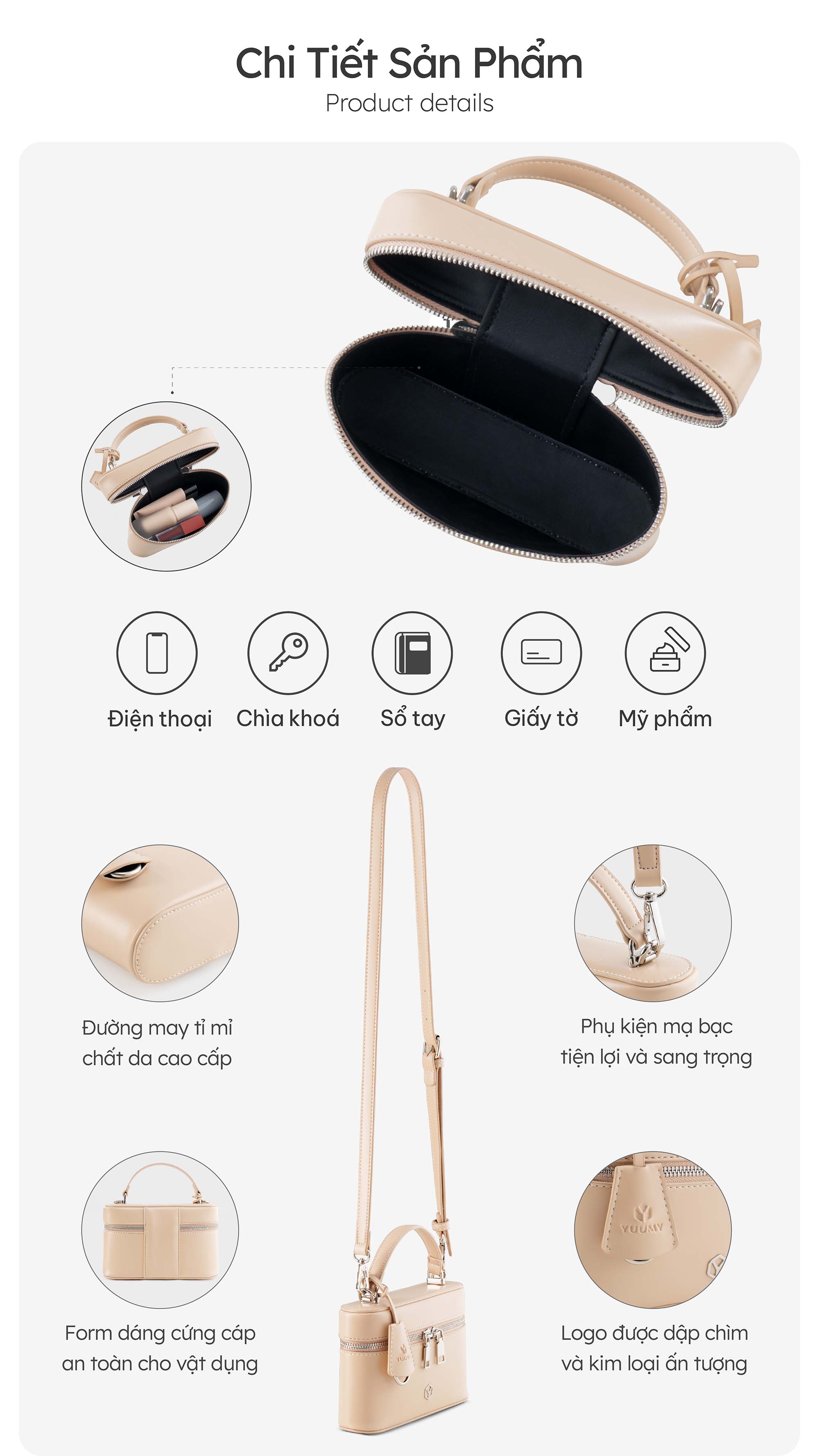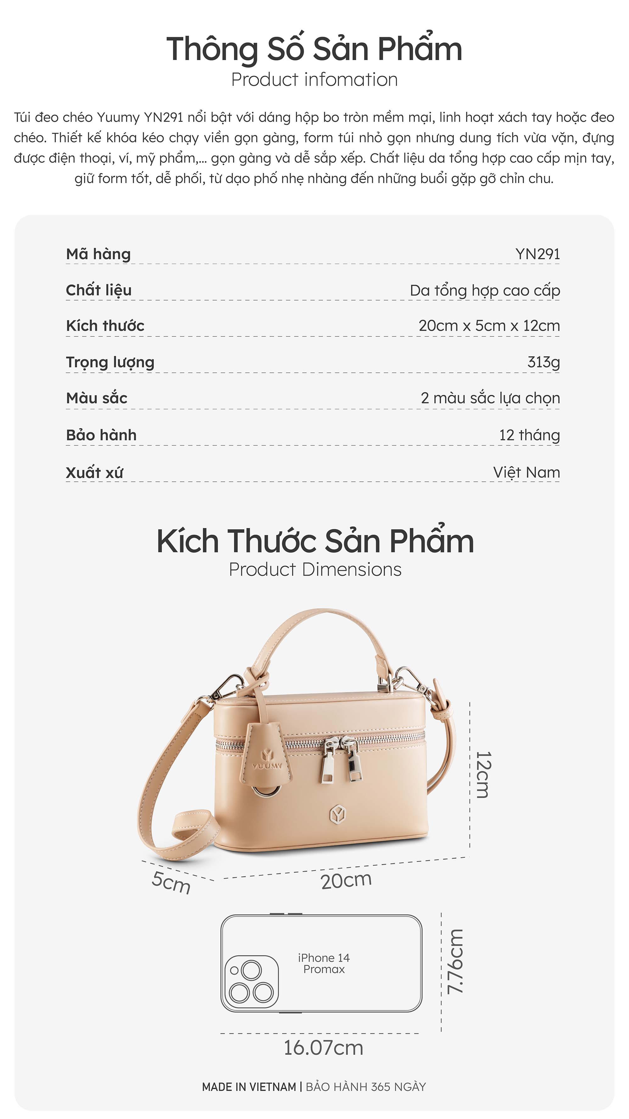 Túi đeo chéo Yuumy YN291 nổi bật với dáng hộp bo tròn mềm mại,có thể linh hoạt xách tay hoặc đeo chéo tùy phong các. Thiết kế khóa kéo chạy viền gọn gàng, form túi nhỏ gọn nhưng dung tích vừa vặn, đựng được điện thoại, ví, mỹ phẩm cơ bản, chìa khóa… gọn gàng và dễ sắp xếp.Chất liệu da tổng hợp cao cấp mịn tay, giữ phom tốt, dễ phối cùng nhiều phong cách, từ dạo phố nhẹ nhàng đến những buổi gặp gỡ chỉn chu. Một chiếc túi nhỏ xinh nhưng đủ để làm điểm nhấn tinh tế cho tổng thể trang phục.