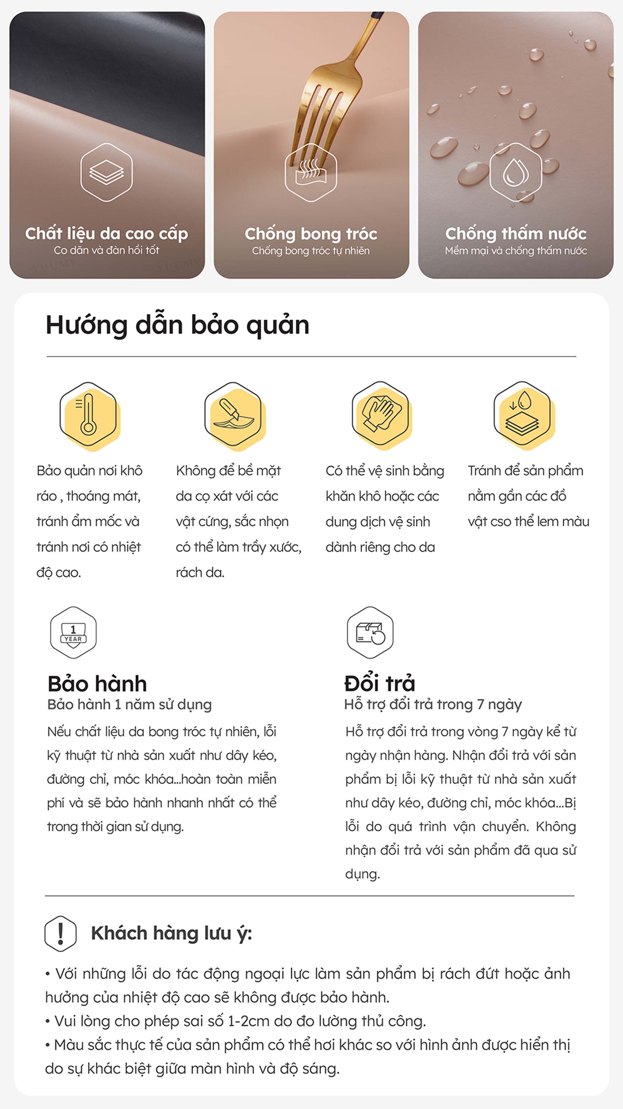 - Có thể vệ sinh bằng khăn khô hoặc các dung dịch vệ sinh dành riêng cho da