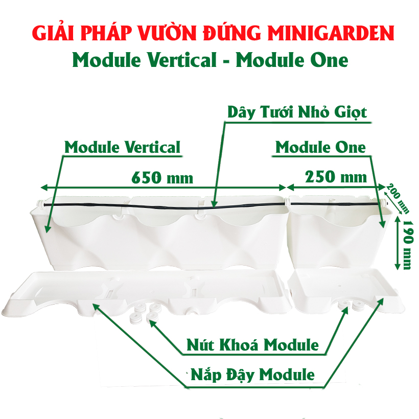 - Khung trồng rau sạch đứng Minigarden Vertical: Ngang 65cm x Cao 20cm x Rộng 20cm