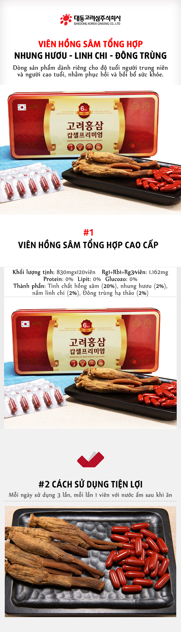 Viên sâm nhung linh chi đông trùng hạ thảo Hàn Quốc Daedong Korea Ginseng 120 viên - Dành riêng cho người trung niên, thể trạng yếu, ăn uống và ngủ kém, cần bồi bổ thể trạng toàn diện