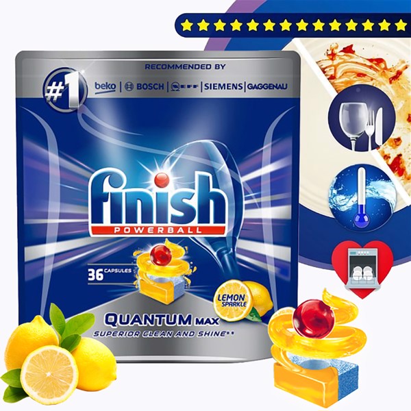 - Riêng với viên rửa chén Finish Quantum Max Dishwasher Tablets Lemon với sự tích hợp lượng muối cao giúp các gia đình ở khu vực độ nước cứng cao thật sự hài lòng.