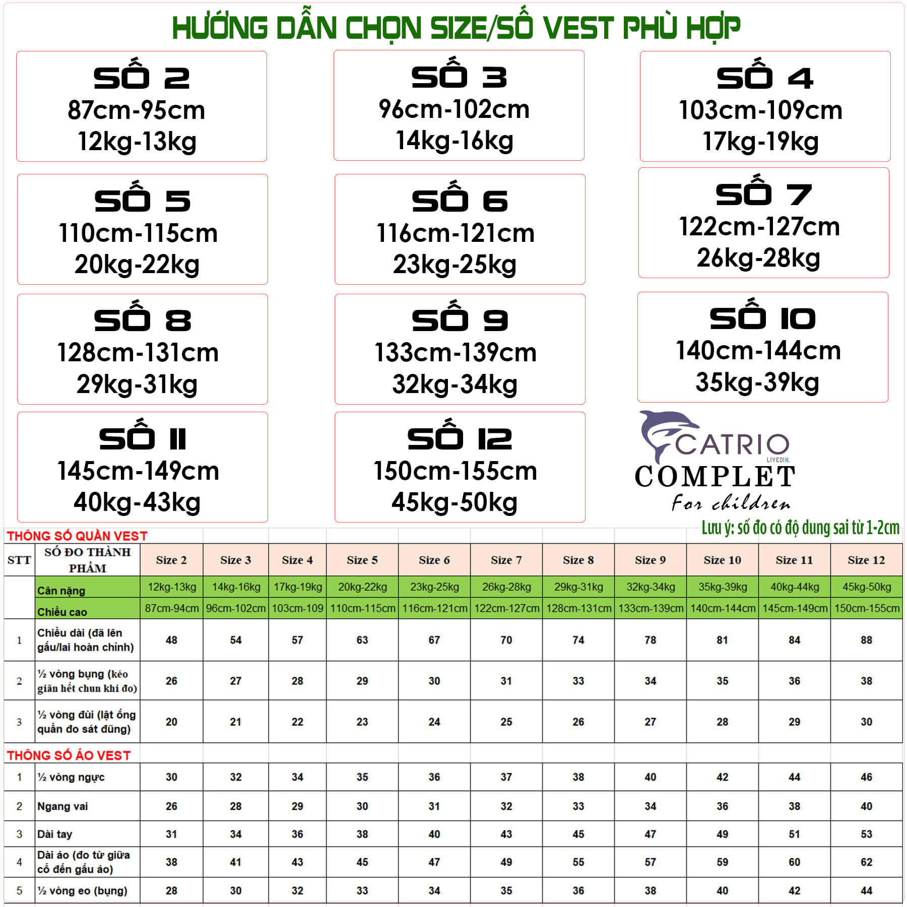 | Kích cỡ | Quý khách hãy chọn đúng size để bé có bộ vest tuyệt đẹpSize 2=12kg-13kgSize 3= 14kg-16kgSize 4=17kg-19kgSize 5=20kg-22kgSize 6=23kg-24kgSize 7= 25kg-28kgSize 8=29kg-31kgSize 9= 32kg-34kgSize 10=35kg-39kgSize 11=40kg-43kgSize 12=45kg-50kg |