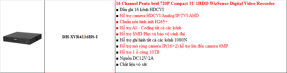 | DH-XVR4116HS-I | 16 Channel Penta-brid 720P Compact 1U 1HDD WizSense Digital Video Recorder ■ Đầu ghi 16 kênh HDCVI ■ Hỗ trợ camera HDCVI/Analog/IP/TVI/AHD ■ Chuẩn nén hình ảnh H265+ ■ Hỗ trợ AI - Coding tất cả các kênh ■ Hỗ trợ SMD Plus và bảo vệ vành đai ■ Hỗ trợ ghi hình tất cả các kênh 1080N ■ Hỗ trợ mở rộng camera IP(16+2) hỗ trợ lên đến camera 6MP ■ Hỗ trợ 1 ổ cứng 10TB ■ Nguồn DC12V/2A ■ Chất liệu vỏ sắt