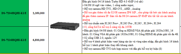 • Đầu ghi hình 04/08 kênh: 01 Cổng ra HDMI/VGA độ phân giải 1920x1080, 16 kênh: 01 Cổng VGA độ phân giải 1920x1080, 01 Cổng HDMI độ phân giải tối đa 4K