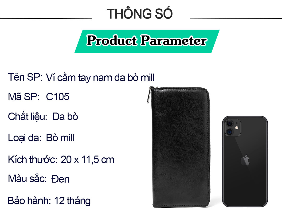 Ví nam cầm tay da bò mill C105 cao cấp, ví dài nam da thật, nhiều ngăn màu đen đựng điện thoại, đồ cá nhân phong cách, Fullbox hộp sang trọng làm quà tặng, thương hiệu Bụi leather chuyên đồ da thật,bảo hành 12 tháng