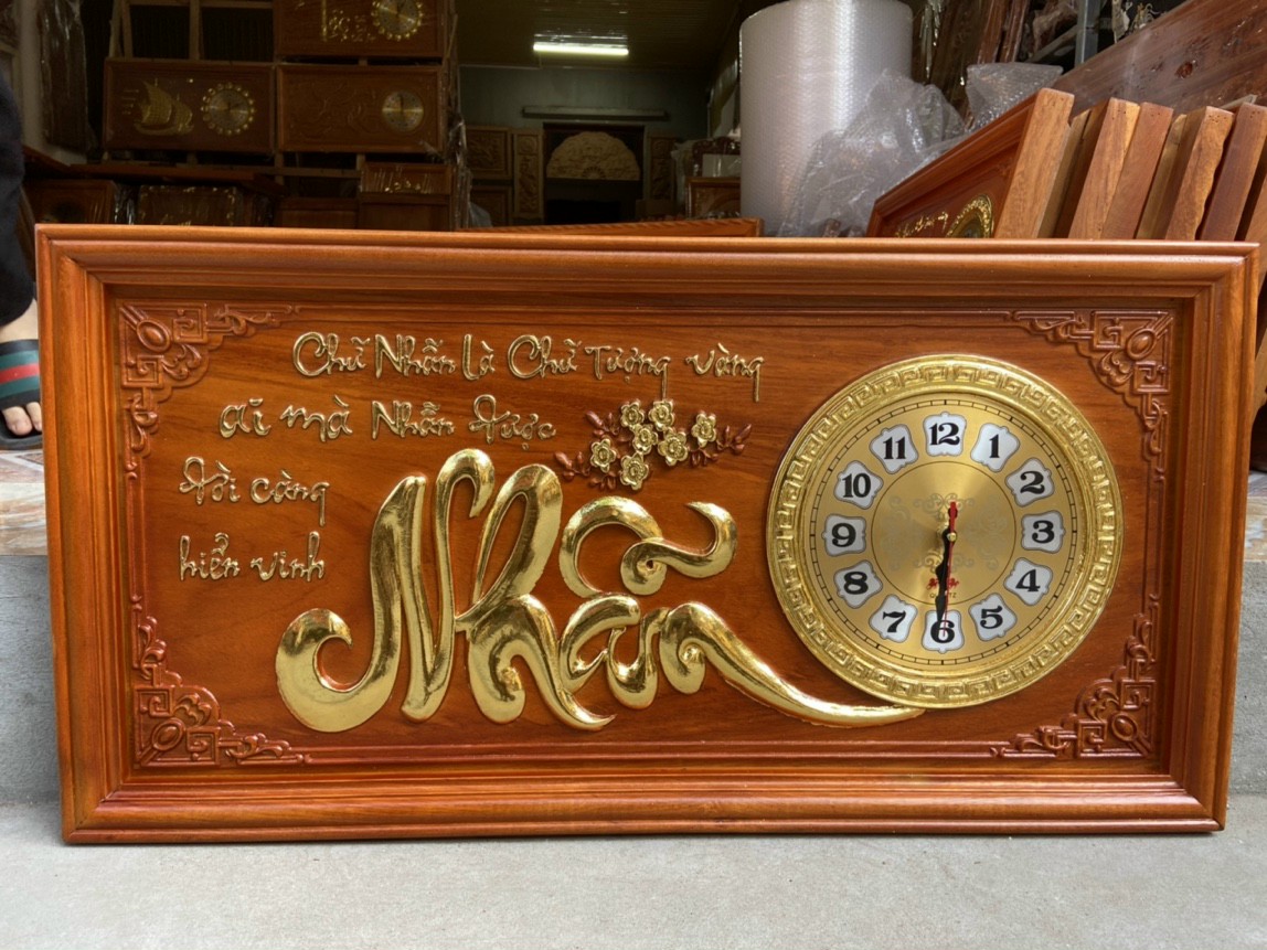 _ Tranh đồng hồ treo tường trạm khắc chữ nhẫn được làm bằng chất liệu gỗ gõ tự nhiên 100%