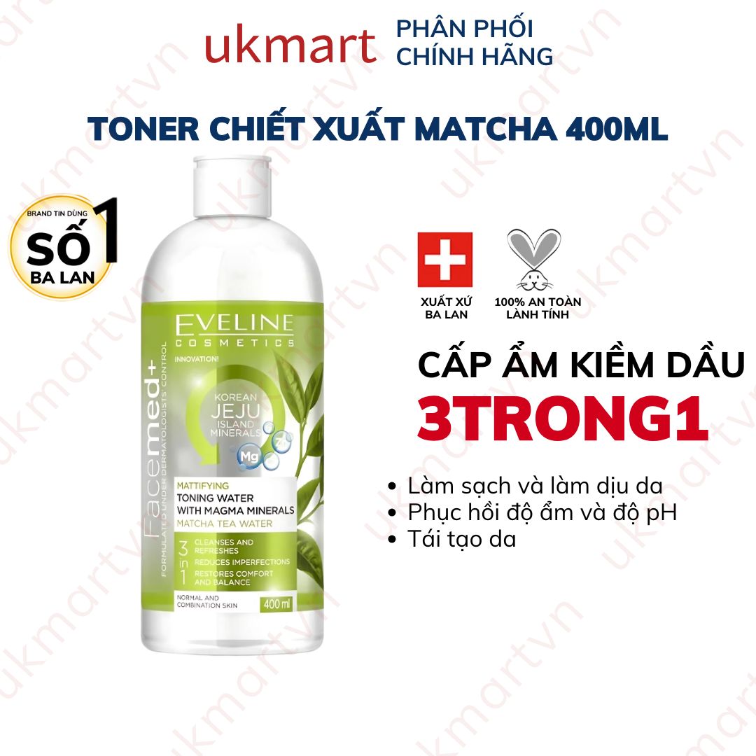 Nước Hoa Hồng Eveline Kiềm Dầu Khoáng Chất 400ml Toning Water With Magma Mineral Matcha Tea