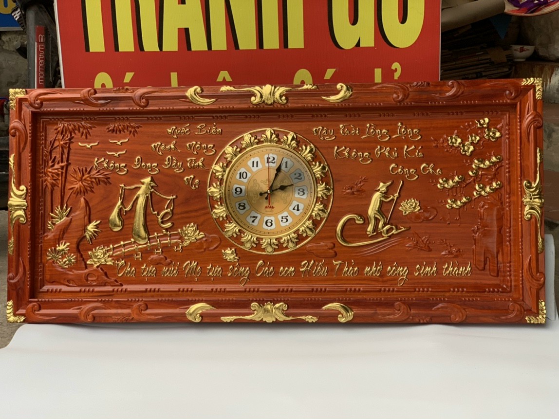 Giới thiệu Tranh đồng hồ treo tường trạm khắc cha mẹ bằng gỗ hương đỏ kt 48×108×4cm