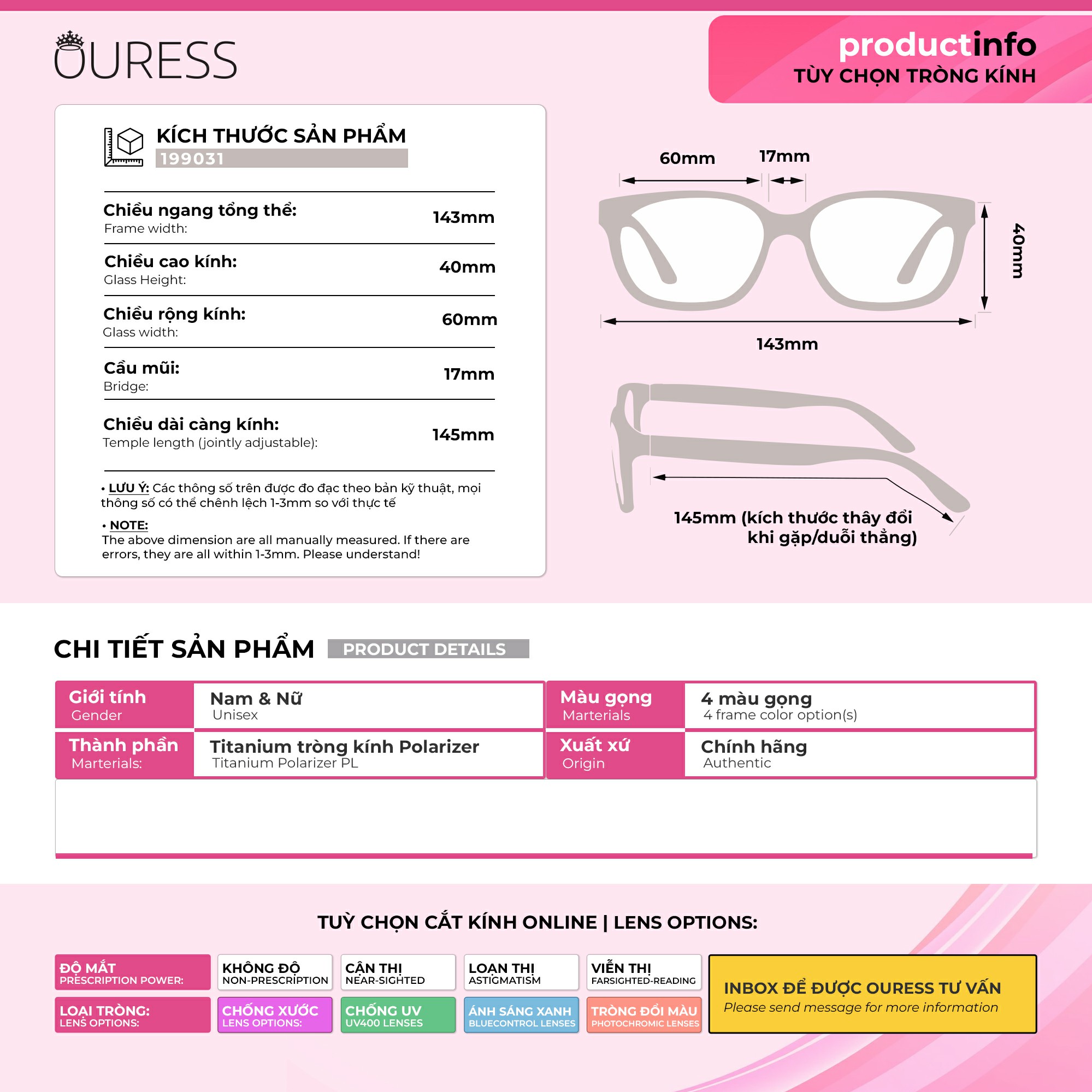 Lưu ý: Quý khách vui lòng cung cấp đầy đủ thông tin như trên cho Ouress trong vòng 02 ngày kể từ ngày đặt hàng. Hết thời hạn mà không nhận được thông tin, Ouress xin phép được gửi mặc định tròng 0 độ để đảm bảo quy định giao hàng của sàn.