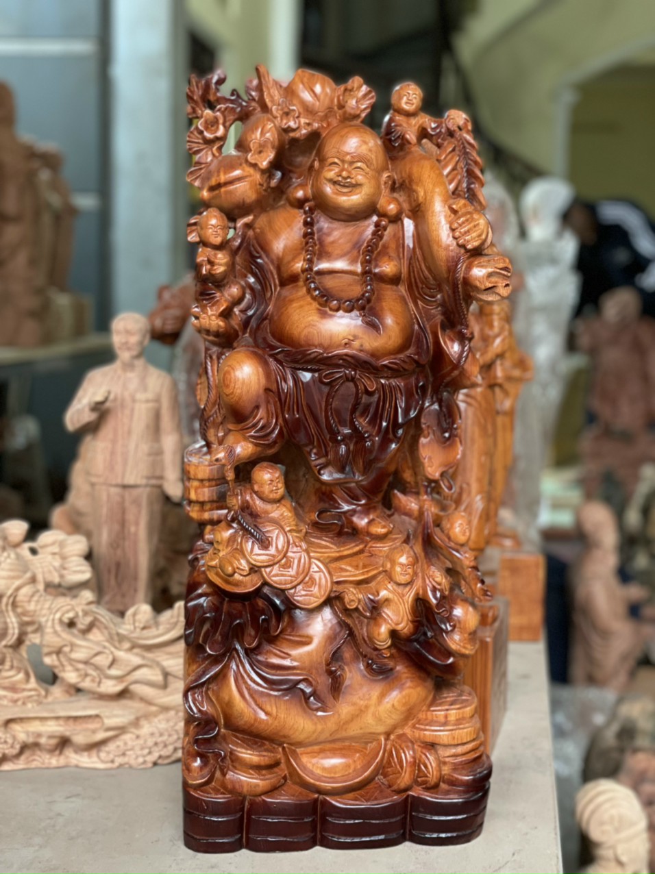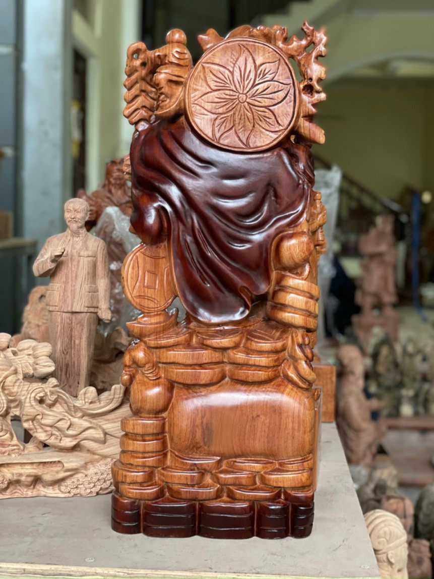 _ Tượng phật di lặc dâng tiền vàng được trạm khắc vô cùng tỉ mỉ tinh sảo kỳ công .Đi hầu hết tất cả mọi chi tiết góc ngách nội dung hoa văn của tượng đều được ngọt tỉa chỉnh sửa hoàn toàn bằng tay thủ công .Đồng thời tượng được kiểm định vô cùng khắt khe kỹ lưỡng như cho vào thẩm sấy cho gỗ khô kiệt .Mục đích trống dập nứt vênh mo mối mọt .Kết hợp với trà nhám ,đánh giấy giáp nhiều lần cho sạch sẽ sờ mát lạnh ,Rồi cho vào phun lót làm bóng mờ để giữ lại mầu sắc vân gỗ tự nhiên ,Chính vì thế Tượng di lặc ngũ phúc đã đáp ứng đầy đủ những tiêu trí ( Đẹp bền rẻ ) Thẩm mỹ nghệ thuật với chất lượng tuyệt vời