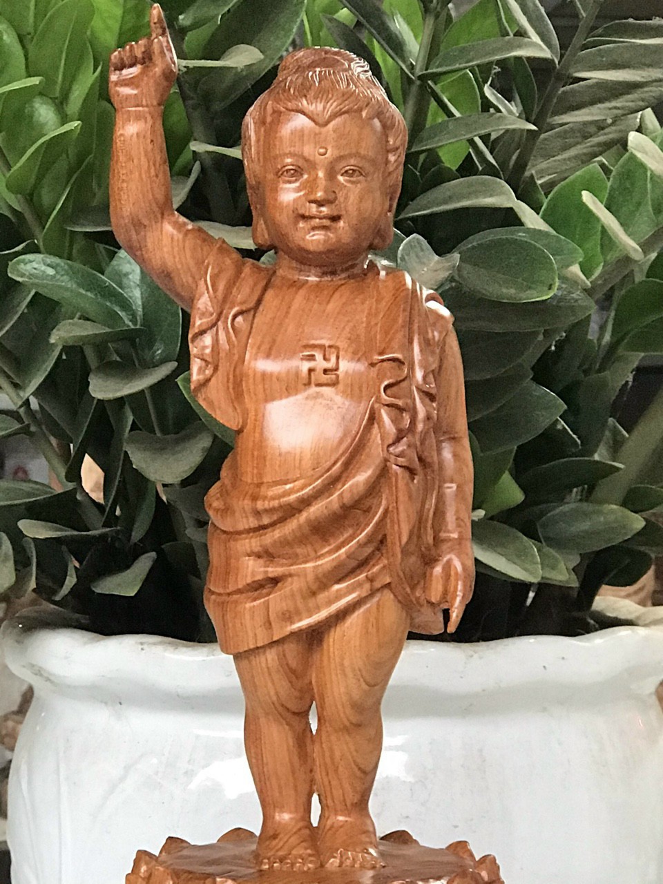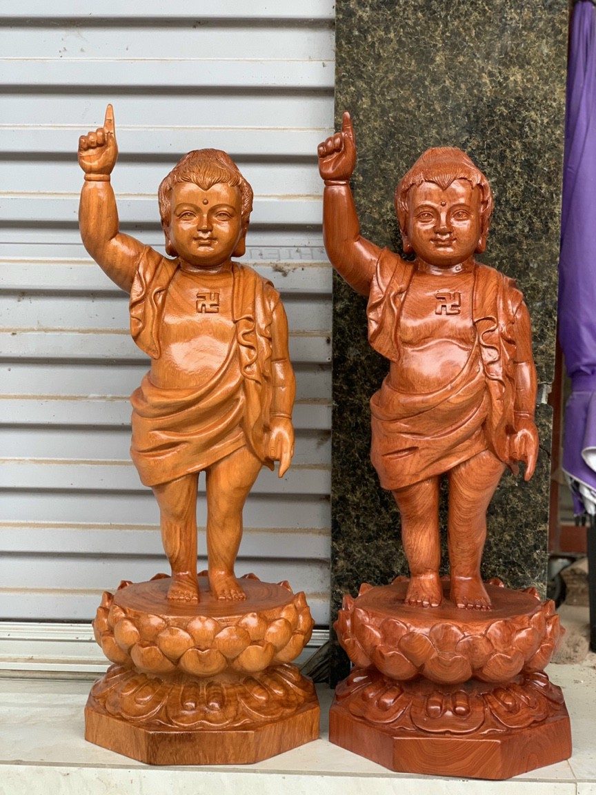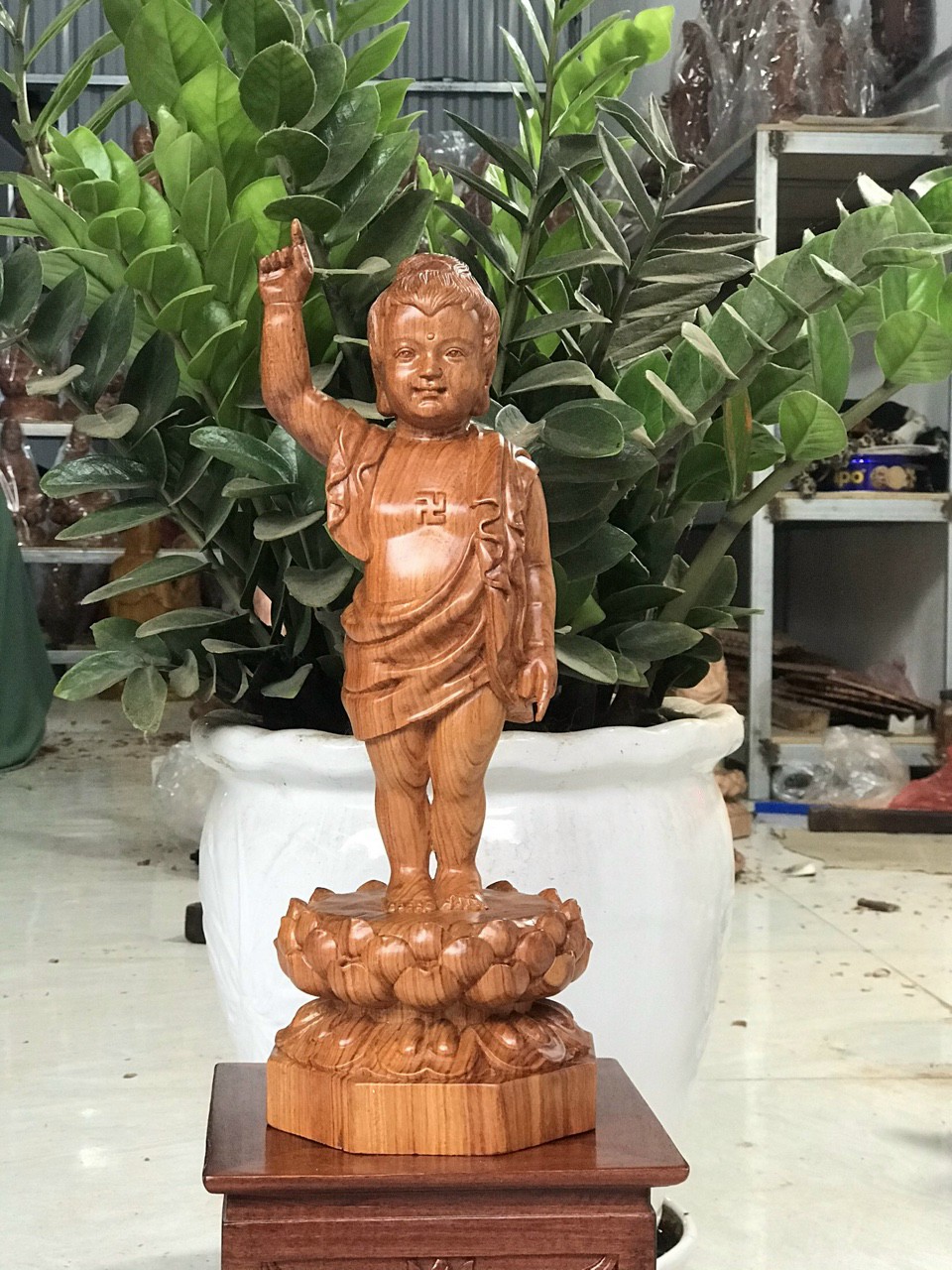 _ Tượng đức phật đản sinh ,được trạm khắc tỉ mỉ ,tinh sảo kỳ công .Đi hầu hết tất cả mọi chi tiết góc ngách nội dung hoa văn của tượng đều được ngọt tỉa chỉnh sửa hoàn toàn bằng tay thủ công .Đồng thời tượng được kiểm định kỹ lưỡng ,như cho vào thẩm sấy cho gỗ khô kiệt .Mục đích trống dập nứt vênh mo mối mọt ,kết hợp với trà nhám đánh giấy giáp kỹ nhiều nước cho sạch sẽ ,Sờ mát lạnh .Rồi cho vào phun lót làm bóng mờ .Để giữ lại mầu sắc vân gỗ tự nhiên .Tượng được làm và hoàn thiện ,do bàn tay khối óc tài hoa .Từ những người thợ giàu kinh nghiệm .Cũng như tay nghề cao trong làng nghề truyền thống .Chính vì thế tượng đức phật đản sinh đã đáp ứng đầy đủ những tiêu trí ( Đẹp bền rẻ ) Thẩm mỹ nghệ thuật với chất lượng tuyệt vời