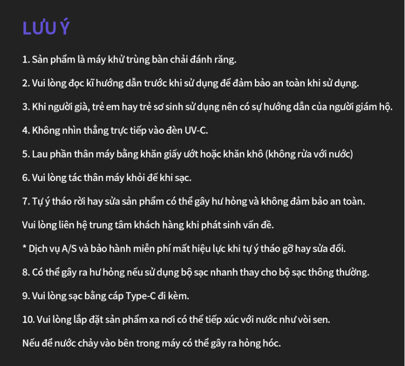 | Hướng dẫn sử dụng | Khử Trùng Mạnh Mẽ 99% Đèn UV-C Tự Động Nhanh Và Mạnh Mẽ Trong 3 Phút Tiêu Diệt 99% Vi Khuẩn Có Hại Trên Đầu Bàn Chải *Treo Bàn Chải Và Đóng Nắp Trượt, Máy Sẽ Bắt Đầu Tự Động Khử Trùng Trong 3 Phút" *Vui lòng không nhìn thẳng vào đèn UV-C" Quạt Turbo Thông Gió Sấy Khô Nhẹ Nhàng Tính năng sấy thông gió và khử trùng Đảm bảo việc chăm sóc vệ sinh hơn Cùng lúc khử trùng và làm khô bàn chải nhanh chóng *Vui lòng đặt bàn chải vào máy trong trạng thái càng ít ẩm càng tốt"