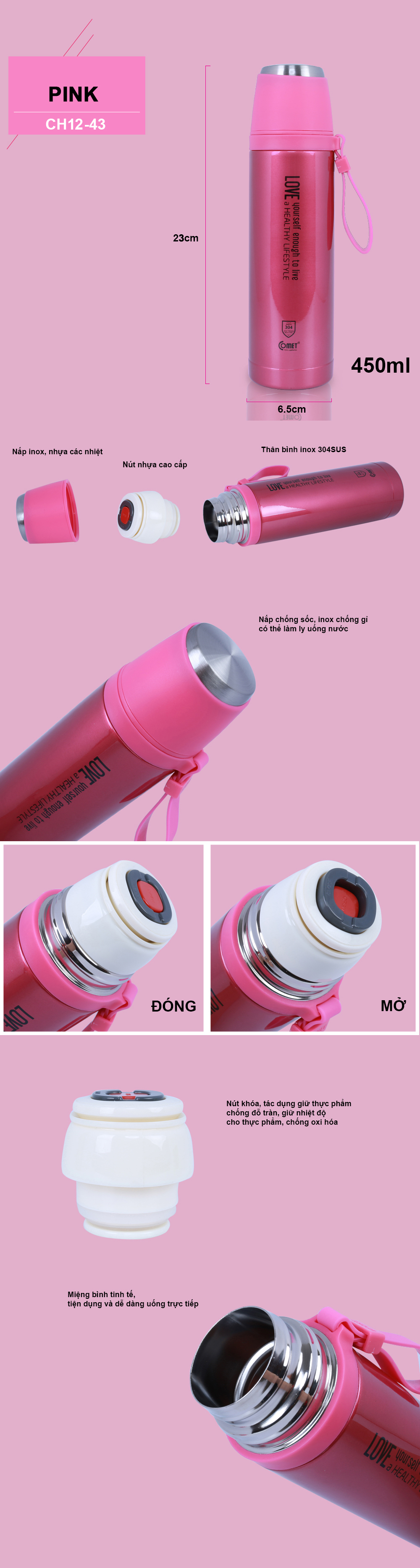 | Hướng dẫn sử dụng | - Bình giữ nhiệt chân không vừa có thể giữ nóng ,giữ lạnh mang lại cho bạn thức ăn; đồ uống nóng sốt - Bình giữ nhiệt này có kiểu dáng xinh xắn; lịch sự; gọn nhẹ; thuận tiện mang theo đến trường; nơi làm việc - Nắp đậy bình giữ nhiệt CH12-43 thiết kế inox chắc chắn; nhựa cách nhiệt, chống tràn khi đựng thực phẩm dạng lỏng , thân bình inox 304SUS - Bình giữ nhiệt Comet CH12-43 được tích hợp nút bấm rót nước; đem lại cảm giác tiện lợi khi sử dụng - Bình giữ nhiệt CH12-43 giữ nhiệt trong vòng 6 - 8 tiếng (tùy nhiệt độ môi trường) |
