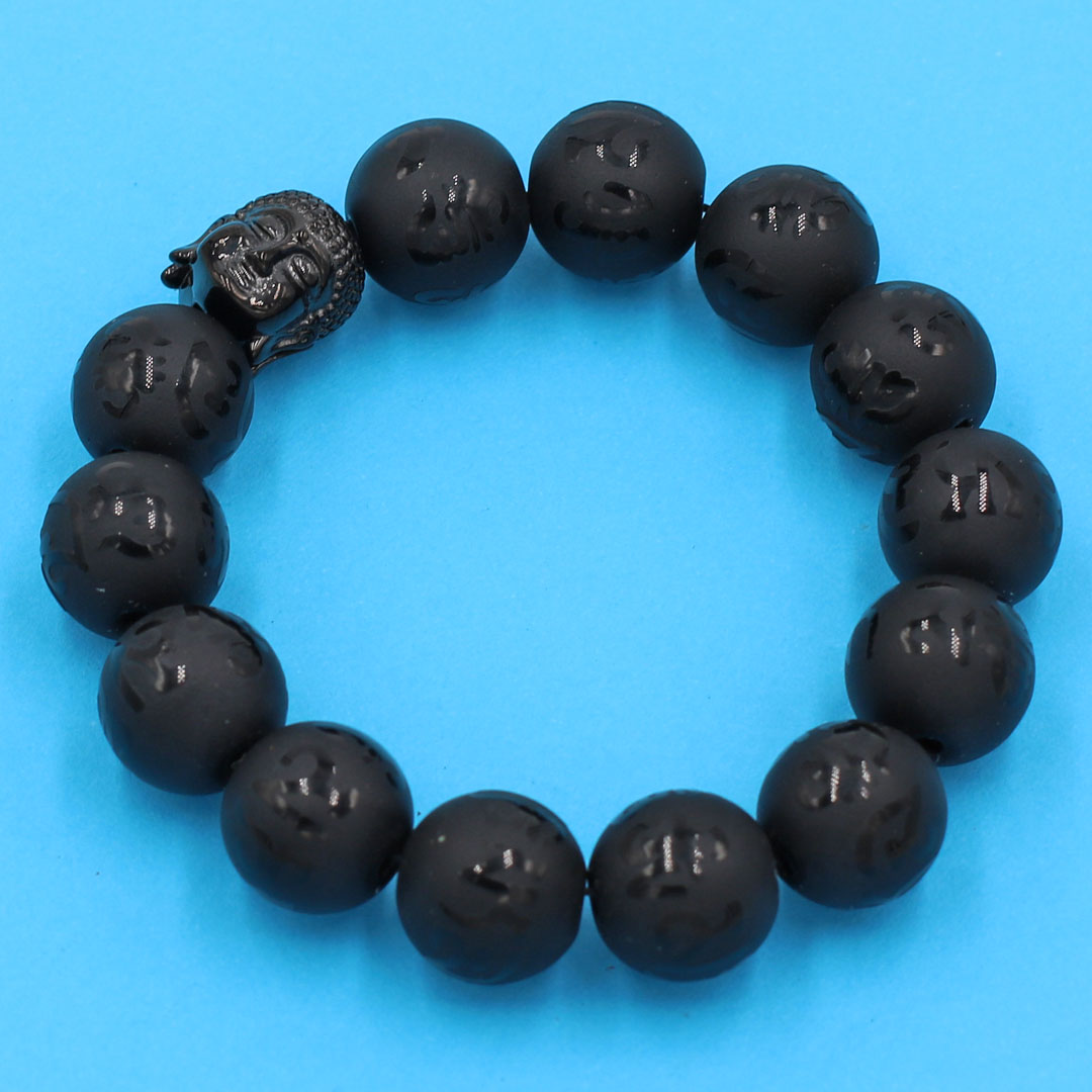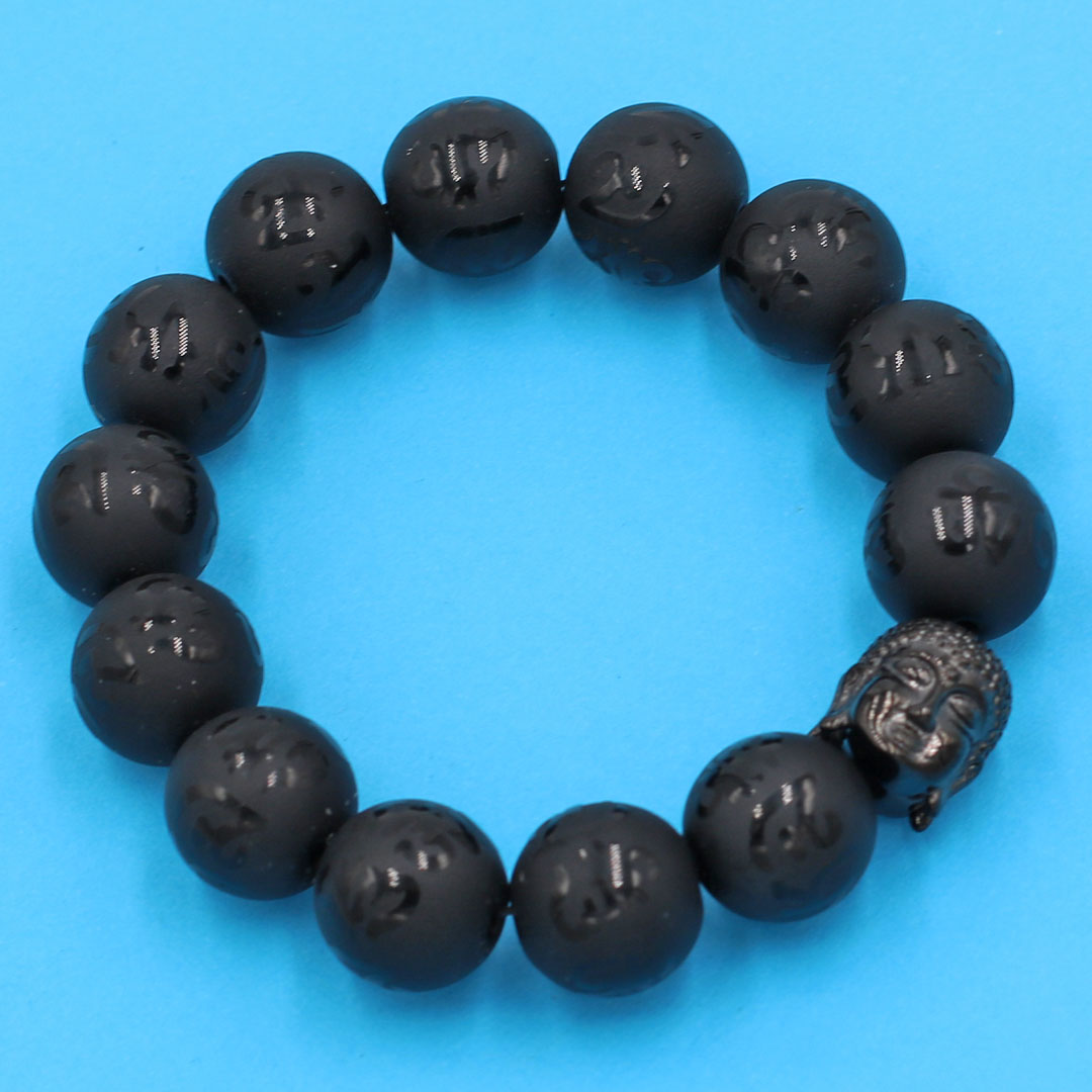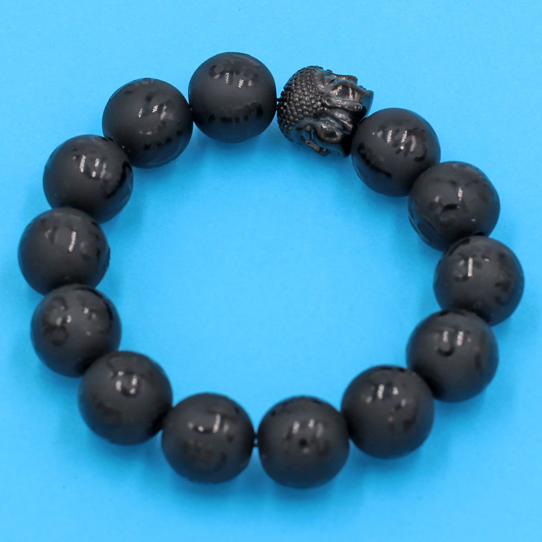 Chuỗi tay thạch anh đen Phật Chú khắc mờ 14 ly - cẩn hạt Như Lai inox đen VTEPCMNLE14 - hợp mệnh Thủy, mệnh Mộc