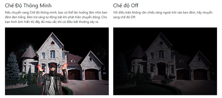 Bốn chế độ quan sát ban đêm thông minh giúp cung cấp hình ảnh có màu hoặc đen trắng rõ ràng ngay cả trong bóng tối hoàn toàn.