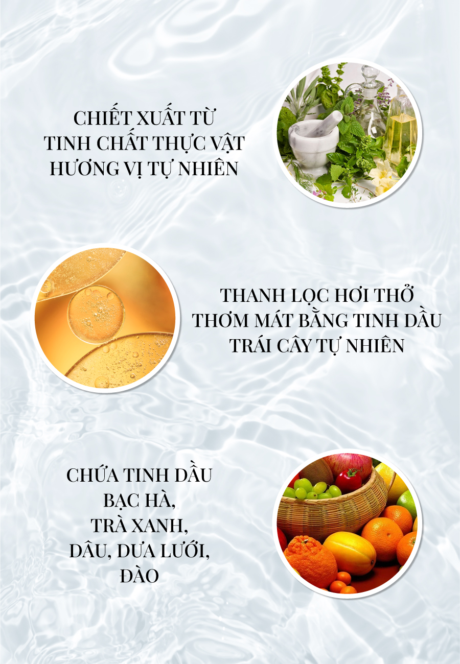 Chiết xuất từ tinh dầu trà xanh - bạc hà hoàn toàn thiên nhiên, cho hương thơm tự nhiên, không nồng, không khó chịu, an toàn khi nuốt.