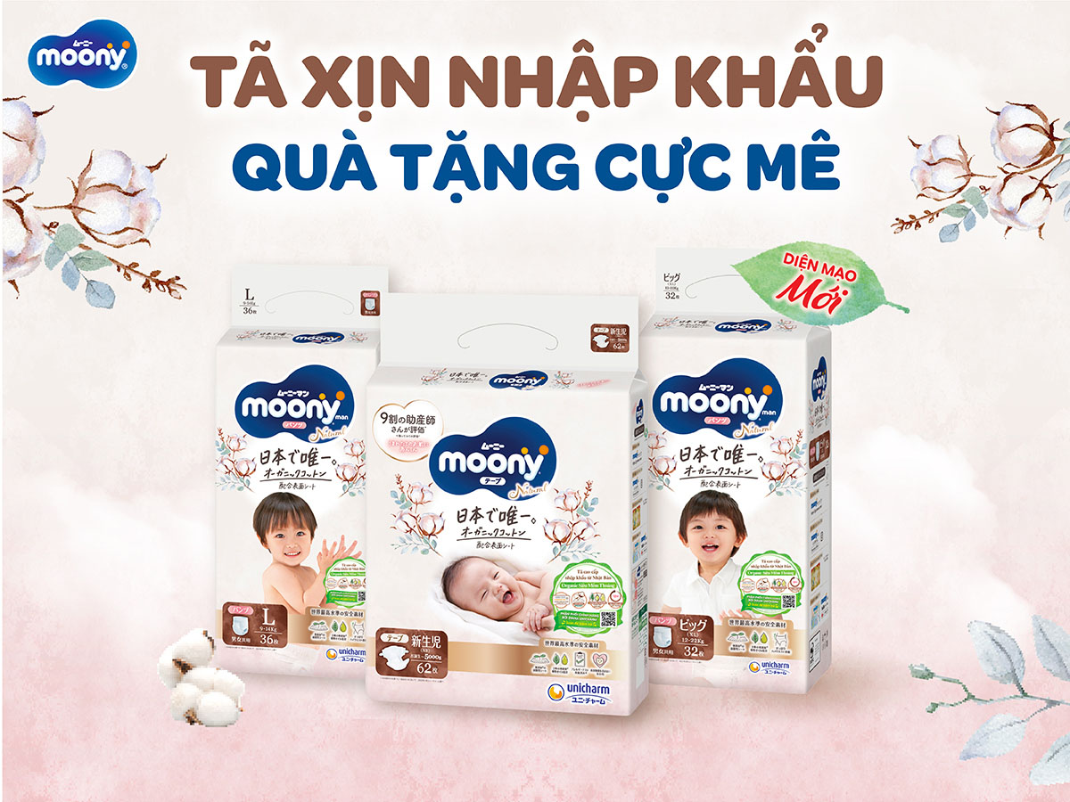 Moony Natural là dòng tã siêu cao cấp được nhập khẩu nguyên gói từ Nhật Bản. Với chất lượng vượt trội cùng thiết kế độc quyền C-shape - thiết kế đặc biệt dành cho bé, tã dán Moony Natural tự hào là dòng tã được Hiệp hội các bà mẹ Nhật Bản bình chọn là dòng tã em bé số 1. Tã/Bỉm dán Moony Natural là sản phẩm tã siêu cao cấp với bề mặt Organic đầu tiên tại Nhật Bản cho làn da nhạy cảm của bé sẽ là hỗ trợ bố mẹ tối đa trong việc chăm sóc và bảo vệ sức khỏe của bé.