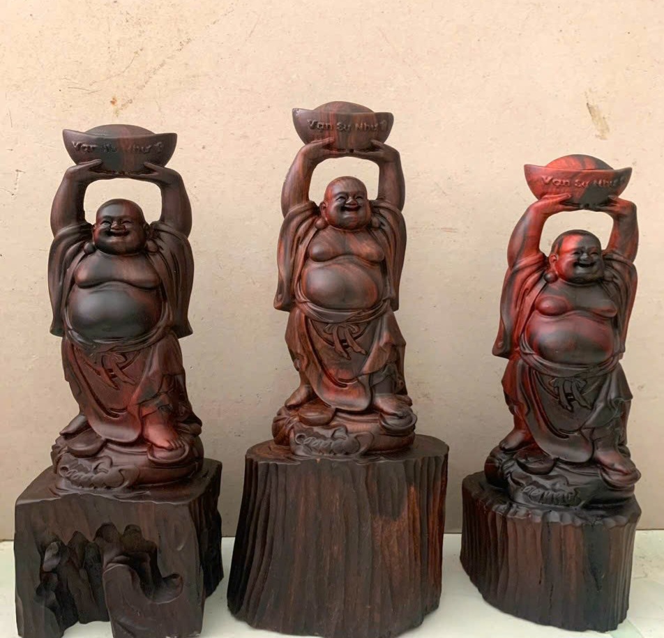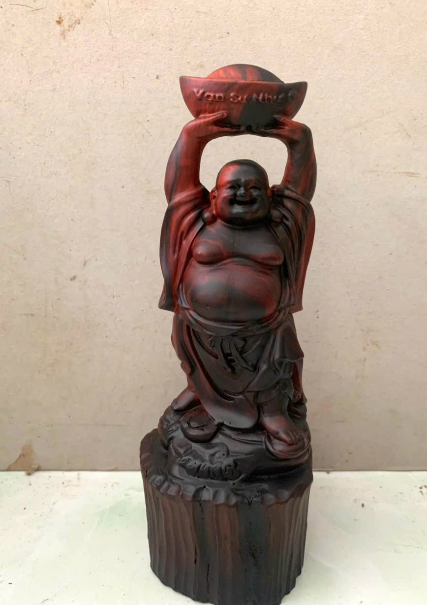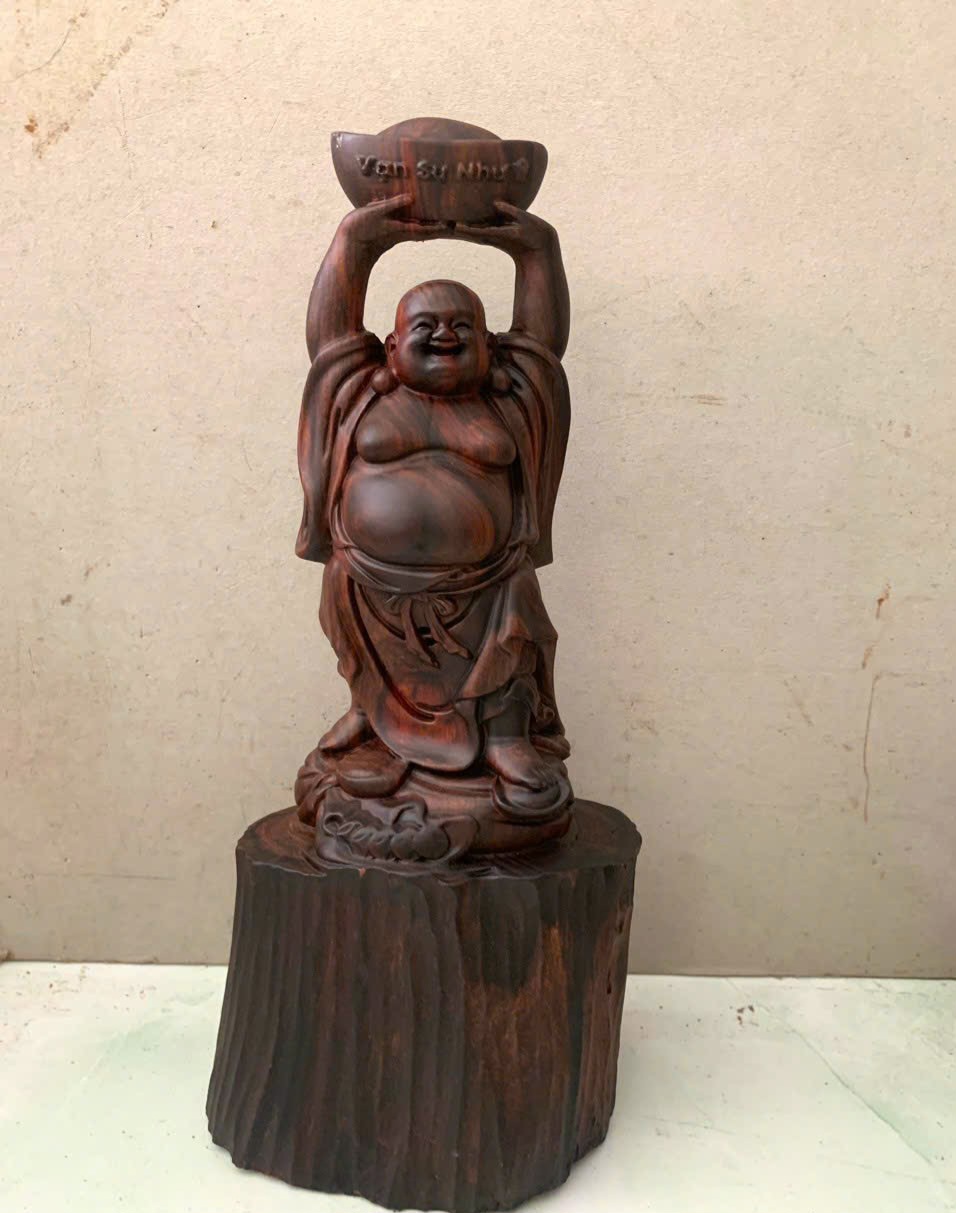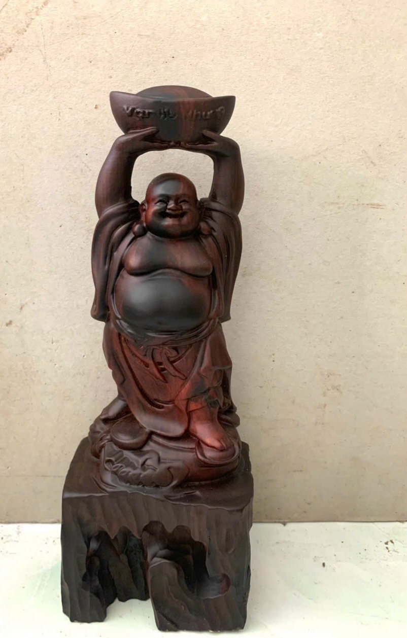 Giới thiệu Tượng phật di lặc dâng thỏi vàng bằng gỗ trắc đỏ đen kt cao 20cm