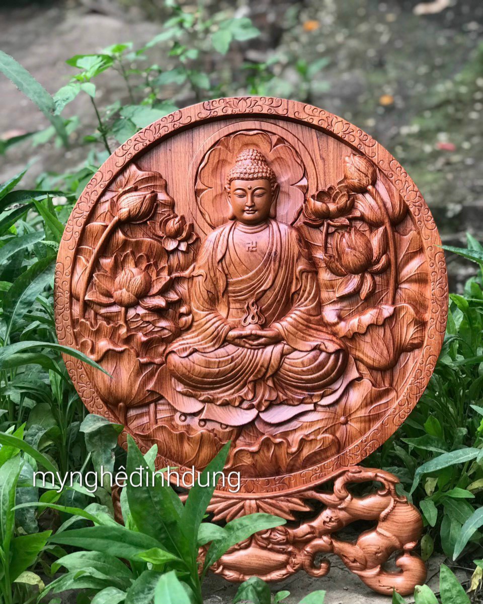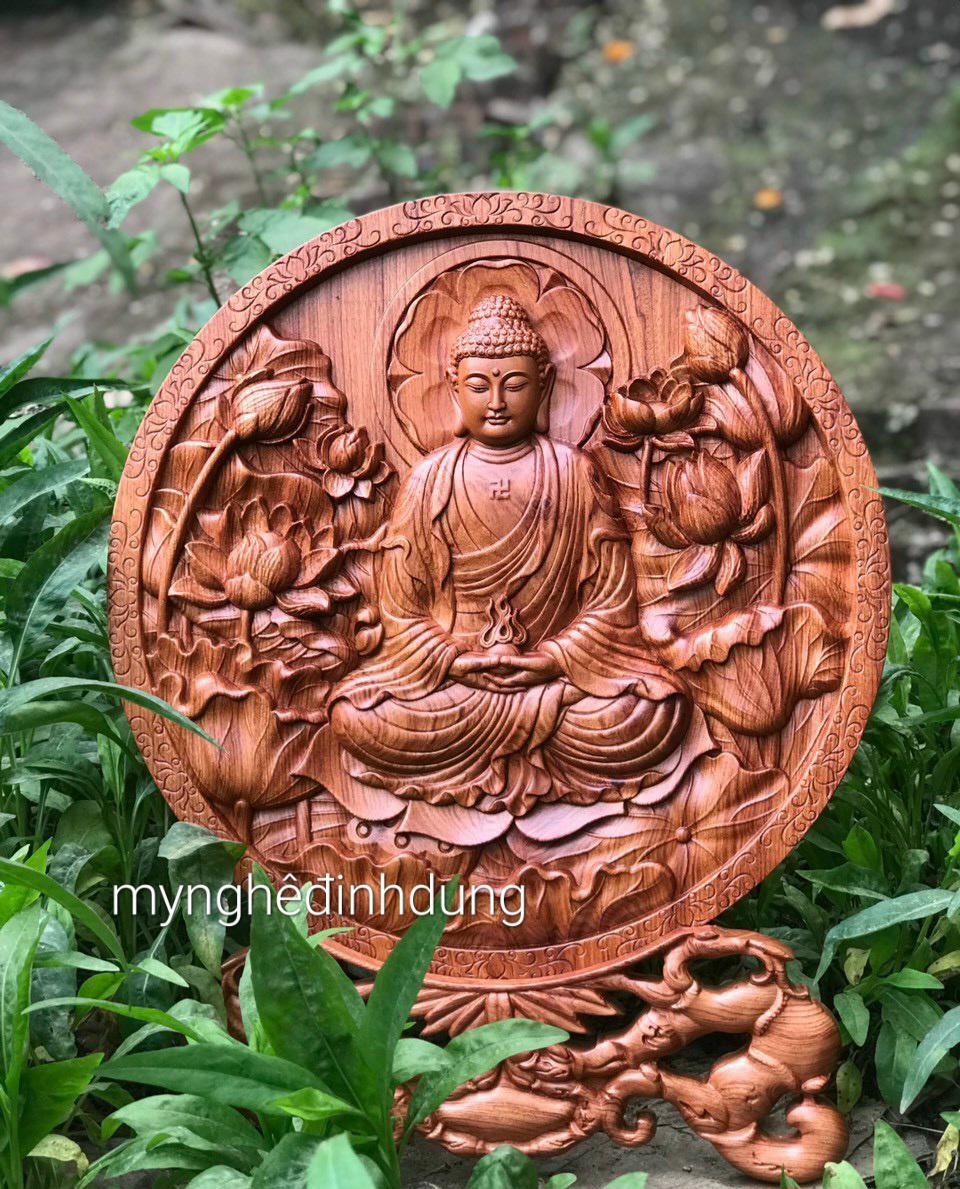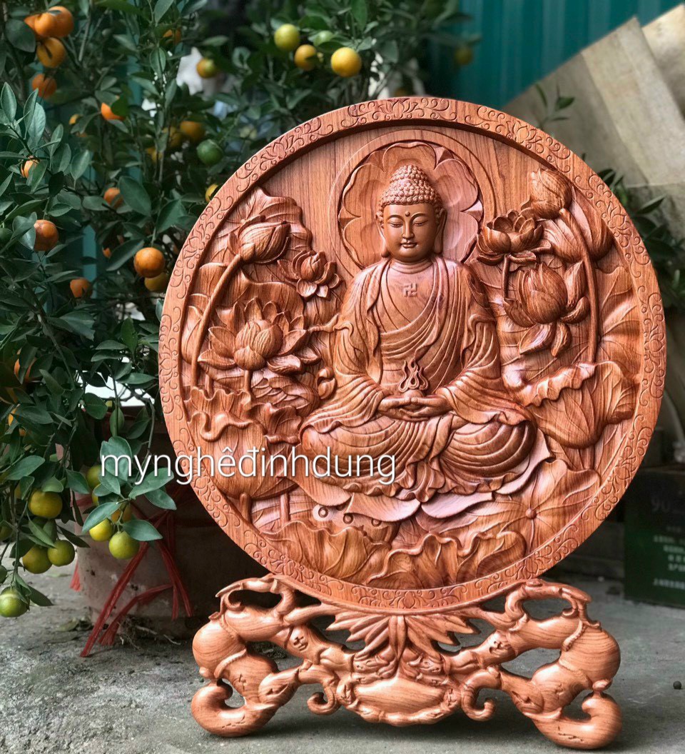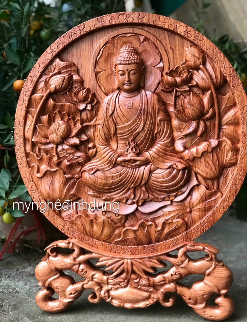 Giới thiệu Đĩa khắc phật adi đà bằng gỗ hương đá kt mặt tròn 40cm