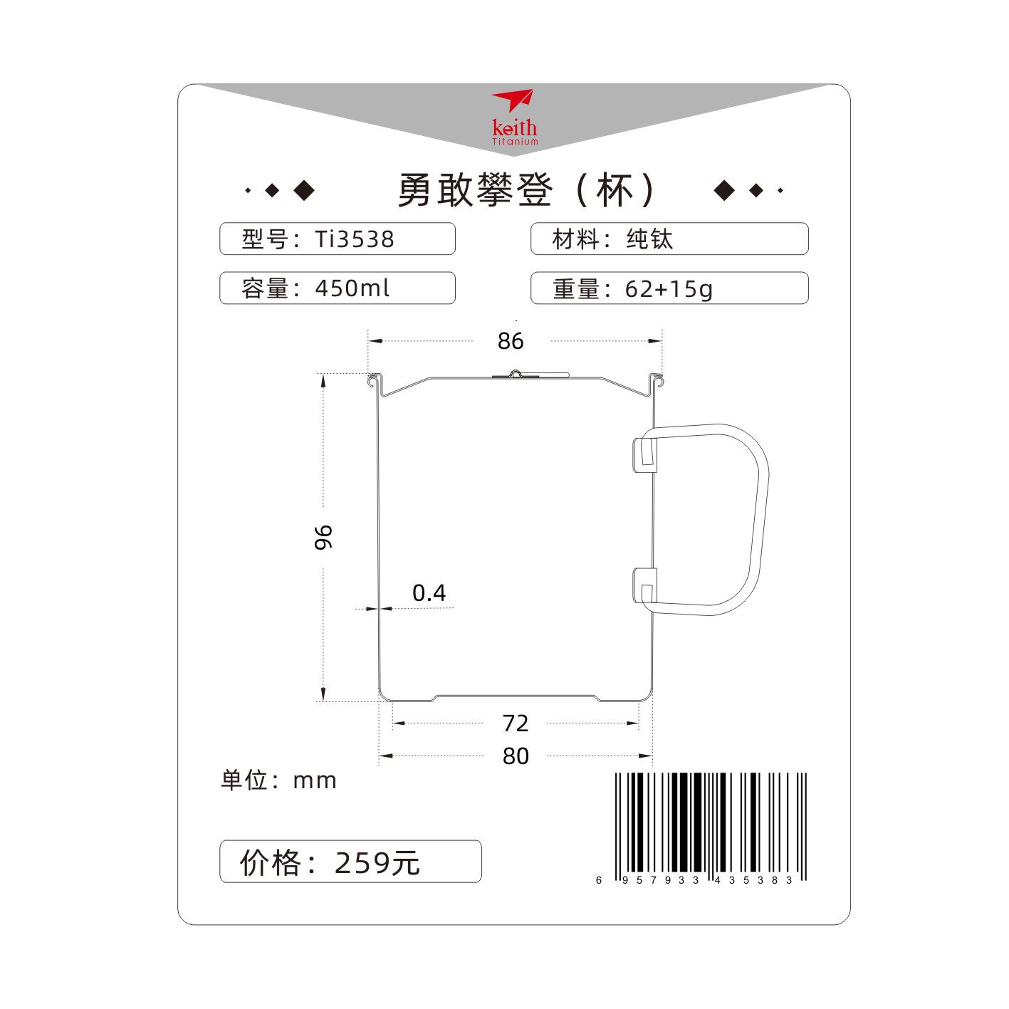 Ti3538 (Brave Ascent): 3.1 × 3.9 in │ Ø 80 × 99 mm, 2.2 + 0.5 oz │ 62 + 15 g, 15.2 oz│450 ml