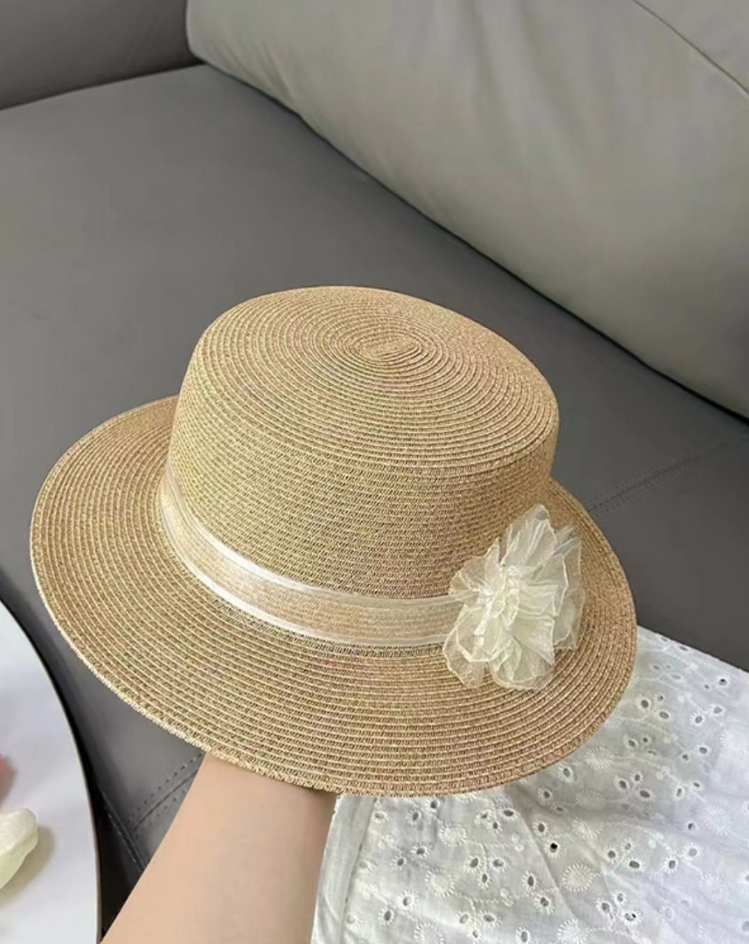 Nón đi biển mũ rộng vành phớt cao bồi cho nữ đai trắng gắn hoa xinh chất liệu cói chống nắng thoáng mát thời trang Hàn Quốc