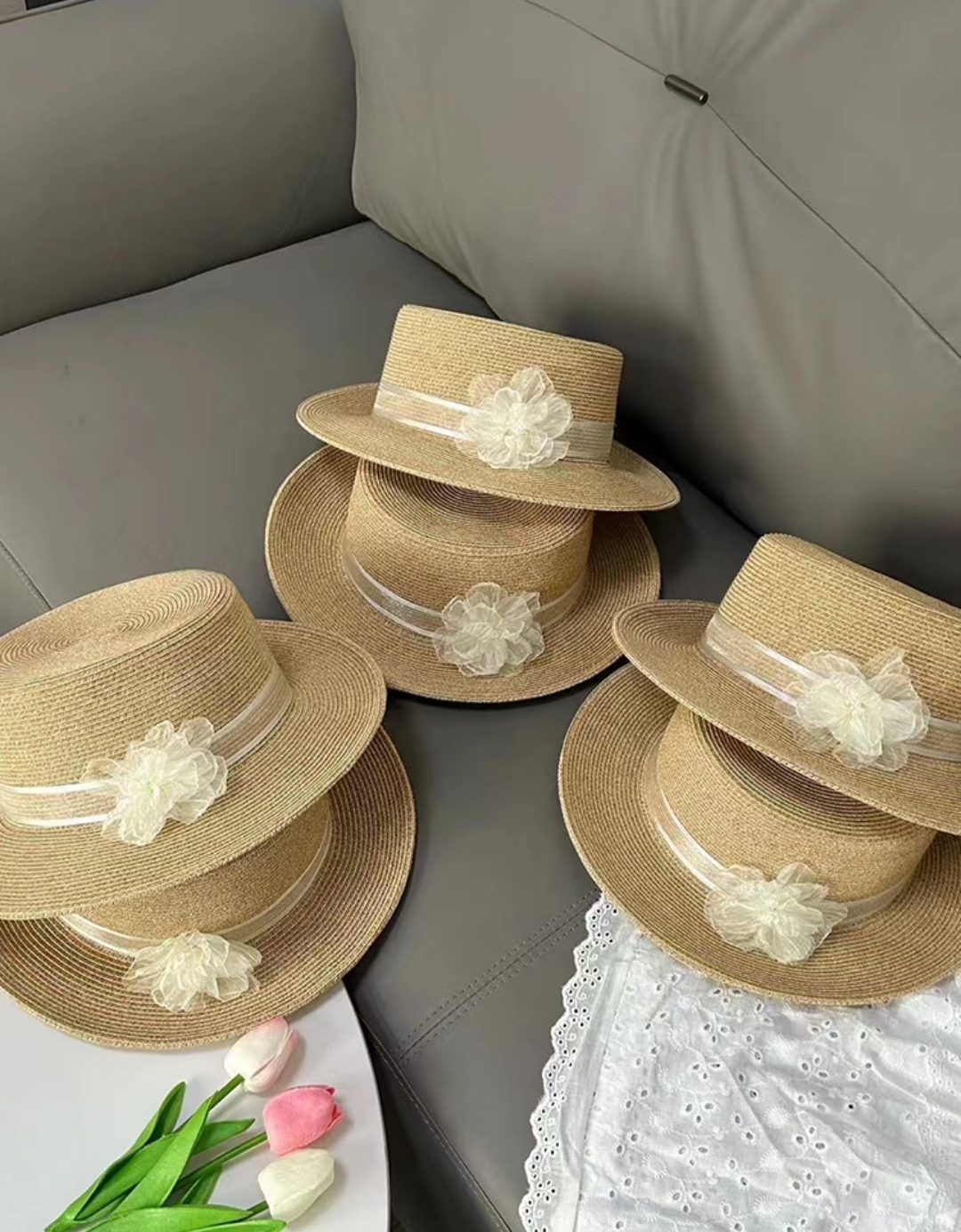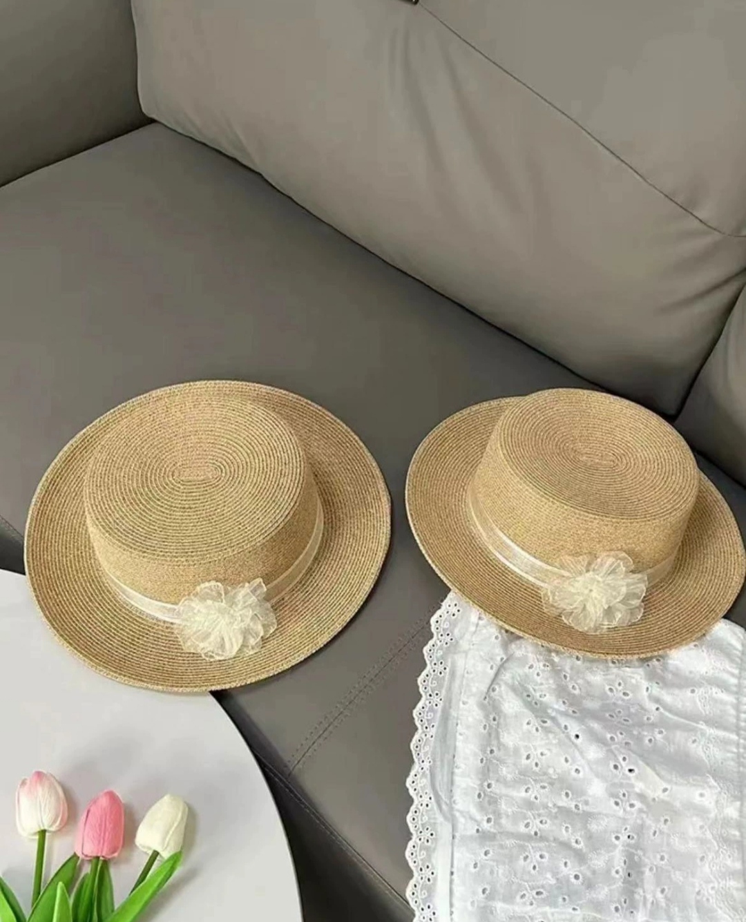 Nón đi biển mũ rộng vành phớt cao bồi cho nữ đai trắng gắn hoa xinh chất liệu cói chống nắng thoáng mát thời trang Hàn Quốc dona240707