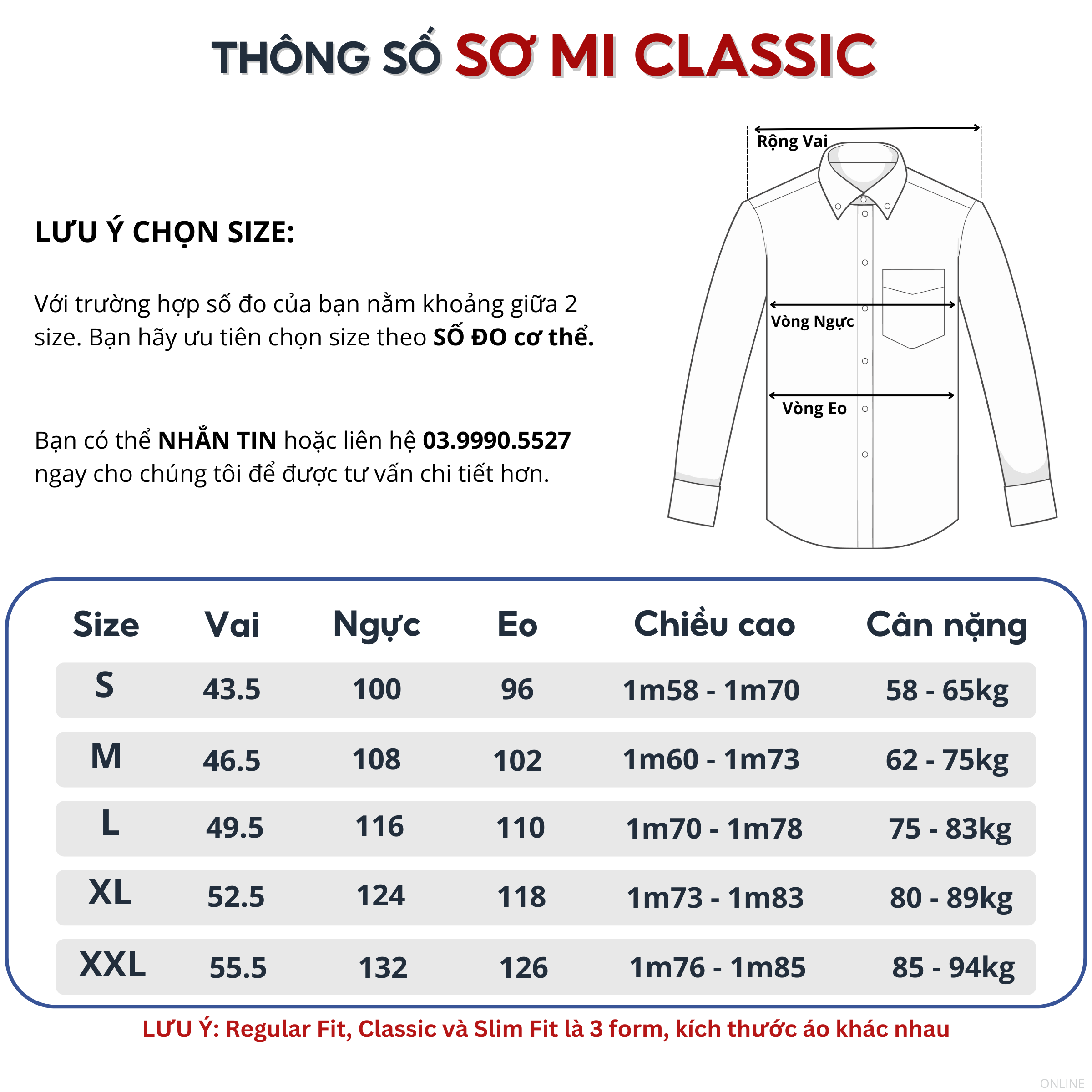 1. Có 3 dáng áo CLASSIC / REGULAR FIT / SLIM FIT với thông số khác nhau, khách hàng lưu ý kỹ thông tin, size số sản phẩm.