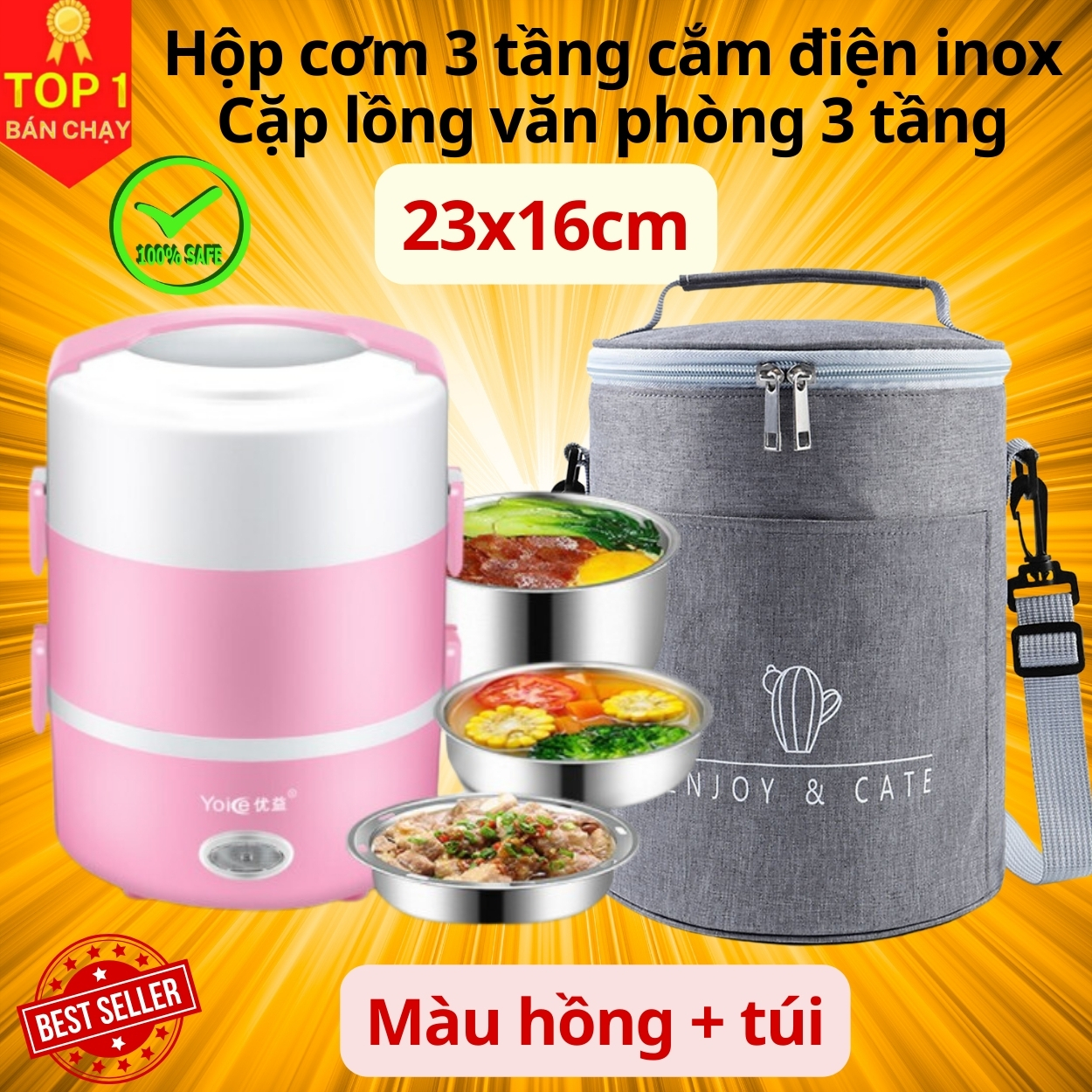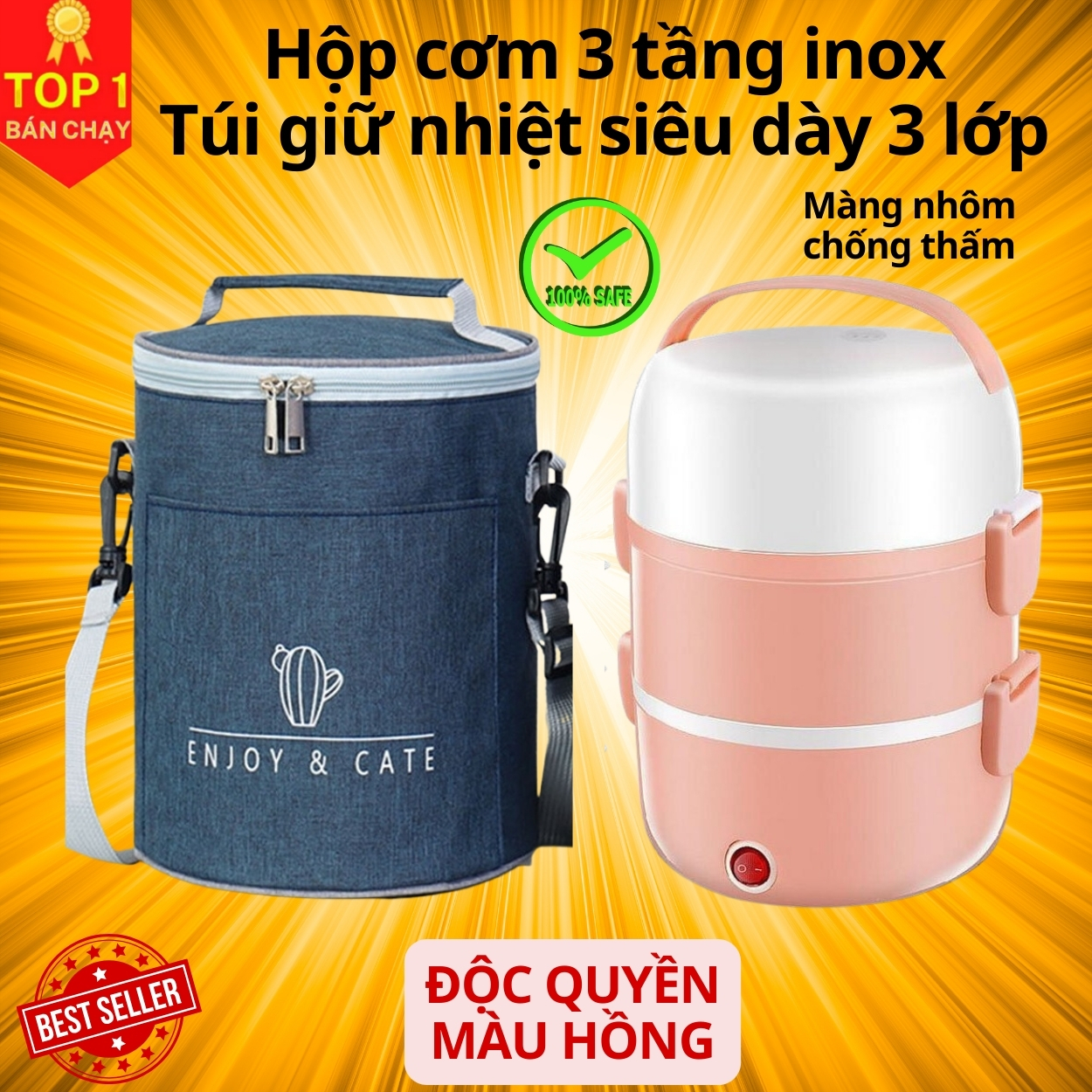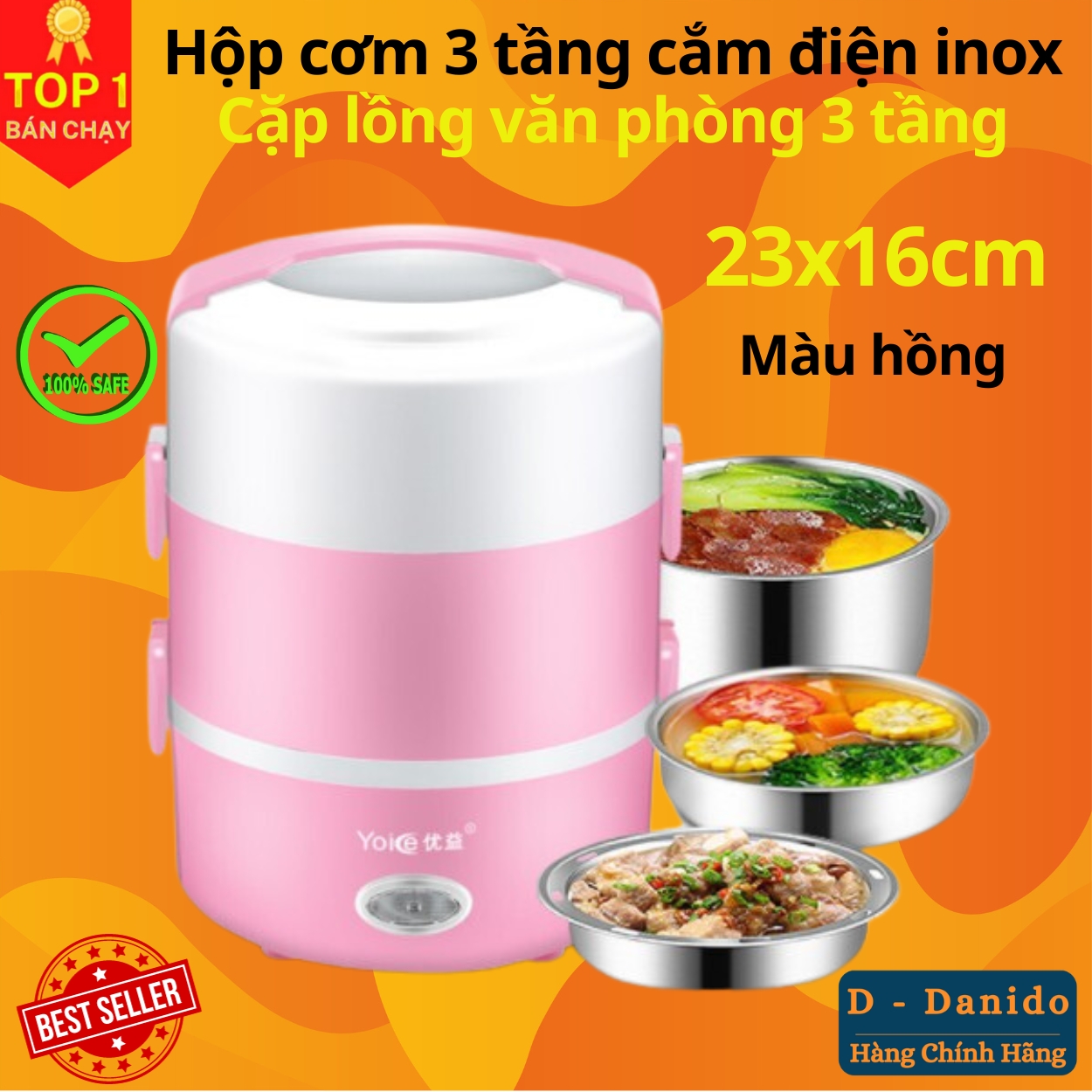 Bộ hộp cơm giữ nhiệt văn phòng cao cấp inox, Cặp lồng cơm 3 tầng cắm điện - Chính hãng D Danido