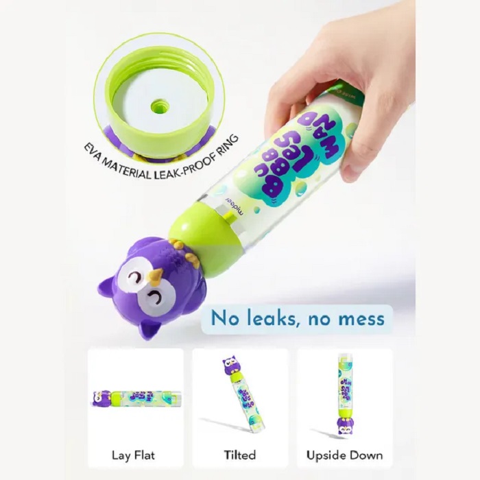 - KHÔNG BỊ RỈ NƯỚC NGAY CẢ KHI DỐC NGƯỢC HOẶC LẮC MẠNH: Với vòng chống rỉ EVA cao cấp, con dễ dàng mang theo gậy thổi bong bóng khi ra ngoài mà không lo túi hay tay bị ướt.
