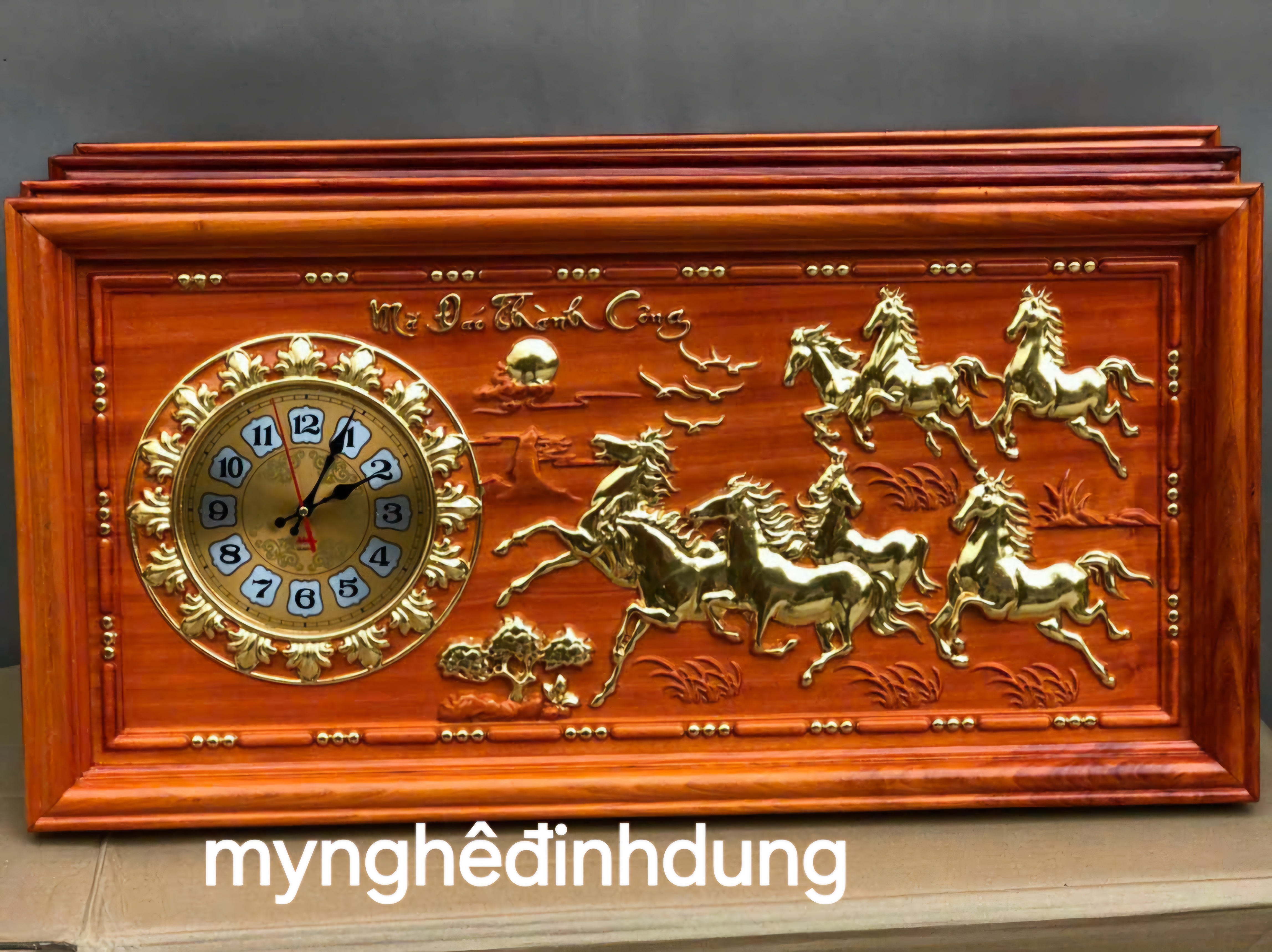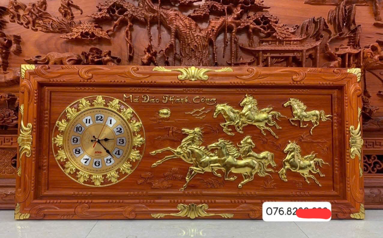 Giới thiệu Tranh đồng hồ treo tường khắc tích mã đáo thành công bằng gỗ hương đỏ 41x81x3cm