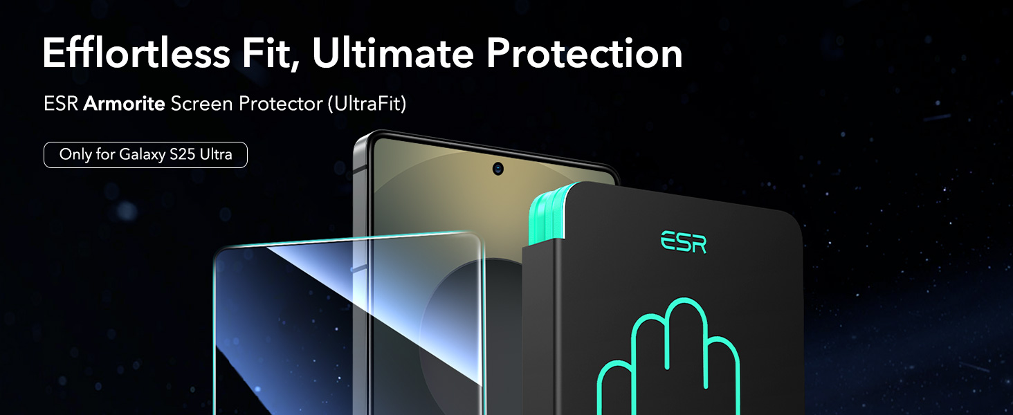 Trong hộp: Miếng dán màn hình ESR Armorite (gói 3 miếng, chỉ dành cho Galaxy S25 Ultra), khay UltraFit, bộ dụng cụ vệ sinh và sách hướng dẫn