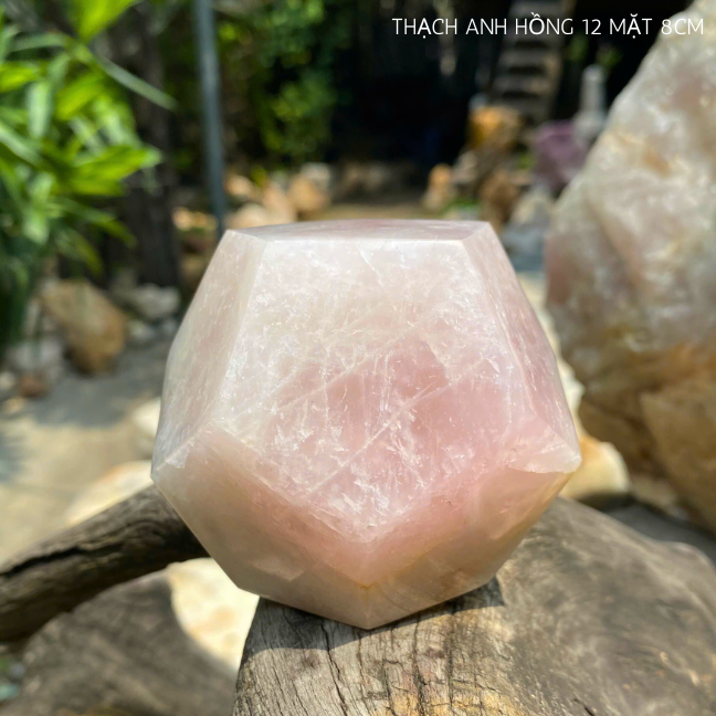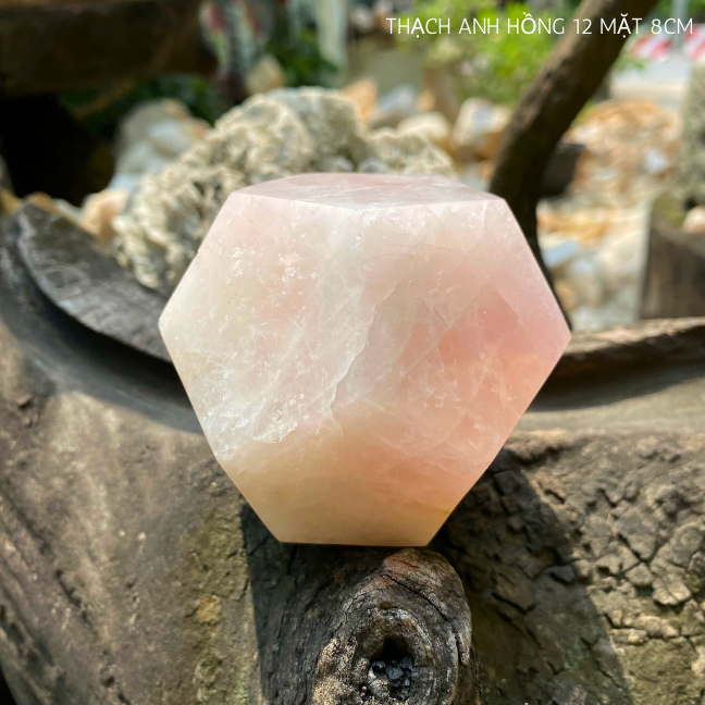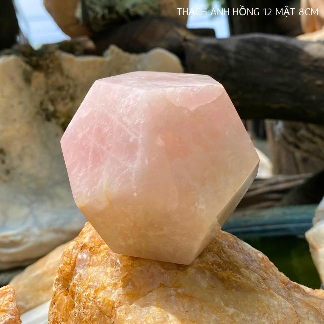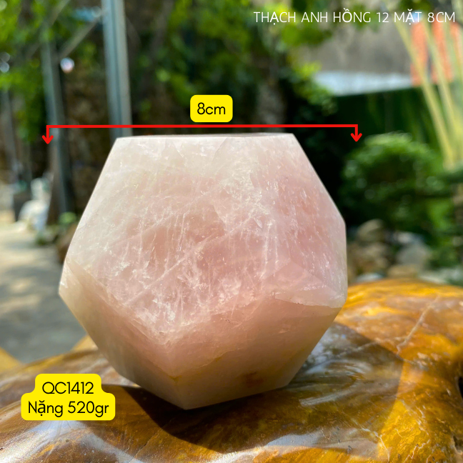 Thạch anh hồng 12 mặt 8cm QC1412 nặng 520gr. Đá tự nhiên 100% từ Nhà Sàn Tây Nguyên. Biểu tượng của tình yêu, sự chữa lành, tăng năng lượng tích cực. Trang trí phong thủy đẹp!